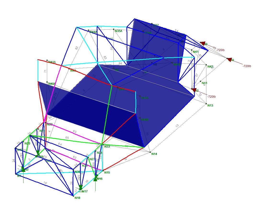 3g Couple at rear yields a 0.114 vertical deflection 3g Couple at front yields a 0.10" vertical deflection 2g Lateral in front yields a WHOPPING 0.70" lateral defelction. This is the worst case. It makes sense too in that the hole where the engine is allows this deflection. I'll have to fix that somehow. I have to wait until the motor is in to add a removable cross brace or just live with it. We will see. |