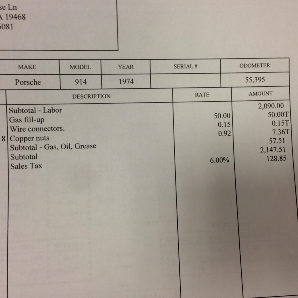 First off, between the work I did when I dropped the engine, and the work they did afterward, a 40 minute drive made it all seem worthwhile. It is running / driving better than it ever has and is probably as close to a new 914 experience as one can get 40 years later. The clunks, fuel smells, stumbles, missed shifts from before all this work have all vanished. In looking at the bill, they did do a lot of work and the individual items add up fast. The last item, which I did authorize, was adjusting the rear sway bar. I gather they heated it it with torch and bent the ends so that it is more like factory bar. That bit alone was $500. Alignment was $400 of it. Of course the state of PA also feels entitled to skim 6% off the total bill in return for, um, taxes. A few items seemed a bit high such as resetting the master cylinder safety switch given that the front tins were already off for wheel alignment. Still, it seems that all the work done was top notch, they addressed a lot of things, and it now runs great. I can now focus on driving rather than repairs or related bills! My other build thread outlines all of the work I did before bringing it to the shop. Here is the breakdown of the work they performed. Back to my original question of great deal, fair deal, etc. I am honestly still not sure but it is what it is and for now I am going to simply enjoy the ride. |