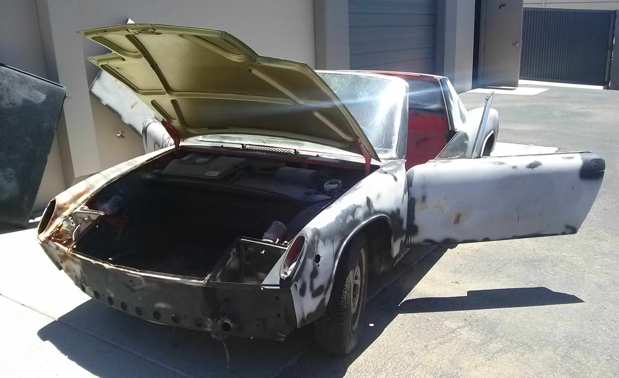 I started disassembling it right before I went off to college. I never drove it again and sold it as a basket case three years later. My second 914 was a project when I bought it. No transmission or engine because the PO had pulled the Buick grand National engine out of it a couple years before I bought it. It had a Chalon kit and the targa bar had been cut off. At some point the PO had added and then removed Testarossa style side bars on it and had not cleaned up the mess. It appeared to be in good shape but as I started to work on it I found the PO was really good at covering rust with fiberglass. I dumped it for a loss soon after. Here is my third attempt at 914 ownership. The transmission for my 1990 922 S2 Cab is in the process of being rebuilt and I was checking Craigslist for a cheap transmission to throw in while I wait for my good trans to be finished. I didn't find any cheap 944 transmissions but I did find a VERY cheap 914. It looked/looks ugly but it has almost no structural rust. The battery tray is gone but the hell hole has just one smallish hole. I will have a patch panel made to replace any weak metal in the area. On the outside of the car, the PO went nuts with black spray paint over grey primer. I've cleaned up most of the black spray paint and some of the primer. The wheels are off and will be media blasted and repainted and I'll throw some basic tires on them for moving the car around during the rebuild. The car is going to be stripped of paint, bondo, and rust by a dustless media blasting company before I decide what direction to go with the bodywork. The options are stock, steel flares, Sheridan kit, or slight flaring of the stock fenders. There are some issues with the existing stock fenders so making major changes won't be messing up a pristine original example. Here are the pics of how it looked the night it came off the truck from the PO. Years of grime and neglect hid a decent set of bones. Attached thumbnail(s) |