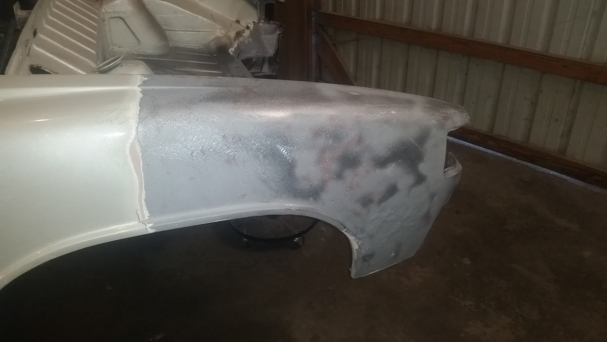 Got there after an early lunch and rolled her outside for some media blasting. Looks like we'll be needing a couple lower back qtr. panel corners. ![]() Mud in the dimples .................... ![]() Right side, not much better. ![]() Filled with mud, rather than repairing. ![]() Better shot of how rippled the left fender is. Now that I can see the entirety of the inside corners I think I should be able to doctor them up. I'll start with hammer and dolly and see if we can make them presentable. In the end they get completely smothered in seam sealer. ![]() ![]() I'll let Doug look for some qtr. panel patches and I'll get back to the trunk and tail light panel. Edit : Forgot we can cut the right one off my parts car. Left was butchered for a flare install that never happened. |