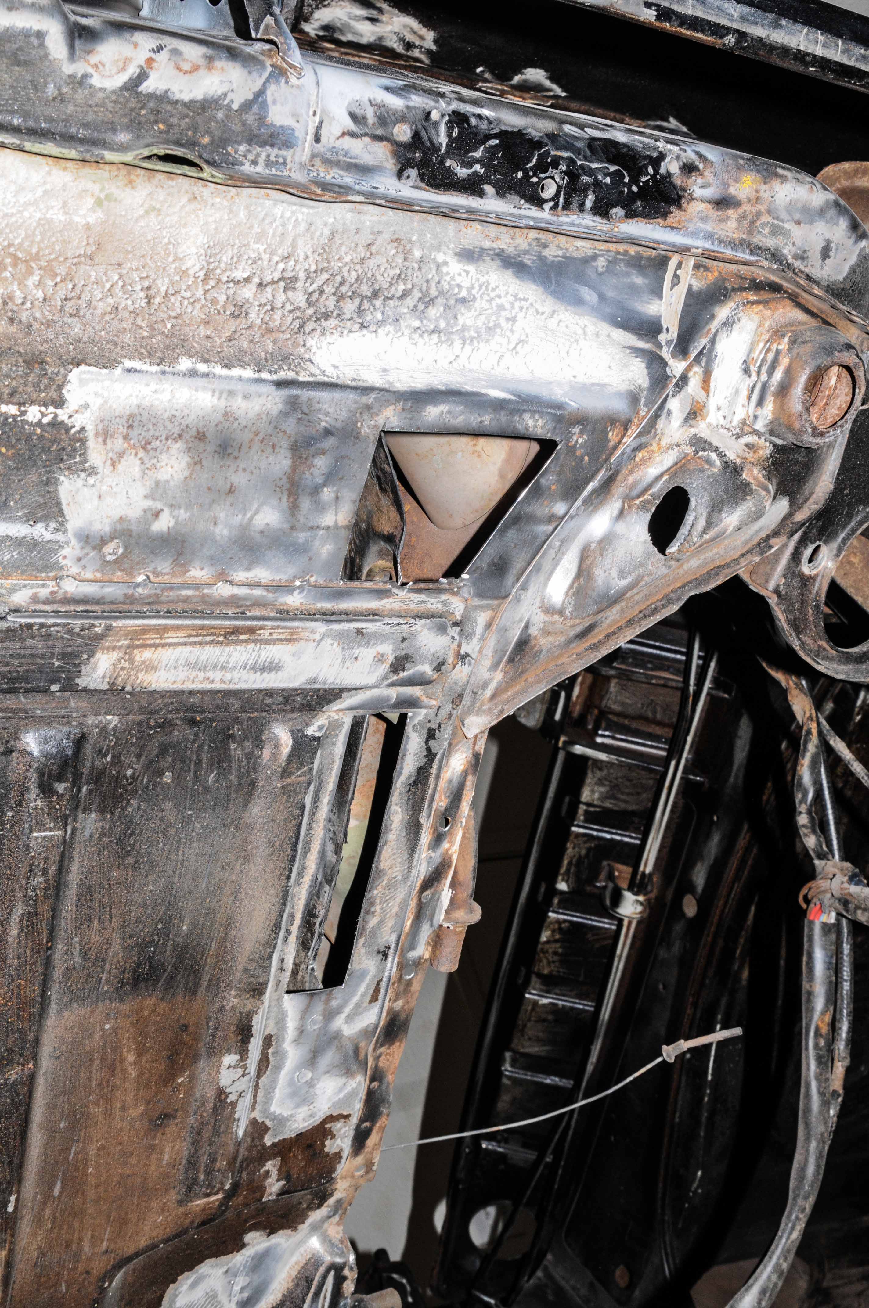 A good day in the shop. I started the day figuring I would quickly fix up the door sill, then fab the jamb, fix a little rust spot on the firewall, and then remove all that nasty foam and seam sealer up in the sail and rear quarter. Like I thought, the door sill was a quick and easy fix and the fabrication of the jamb took some thinking and work due to the nature of the curves. However, I hit a wall with that "little rust hole" in the firewall. As you can see from the photos, I had to do some cutting. Now I will admit that I cut a little more than necessary, but why not. Finished the day playing with wire wheels and rust treatments, leaving the fabrication and welding for the next day. Attached thumbnail(s) |