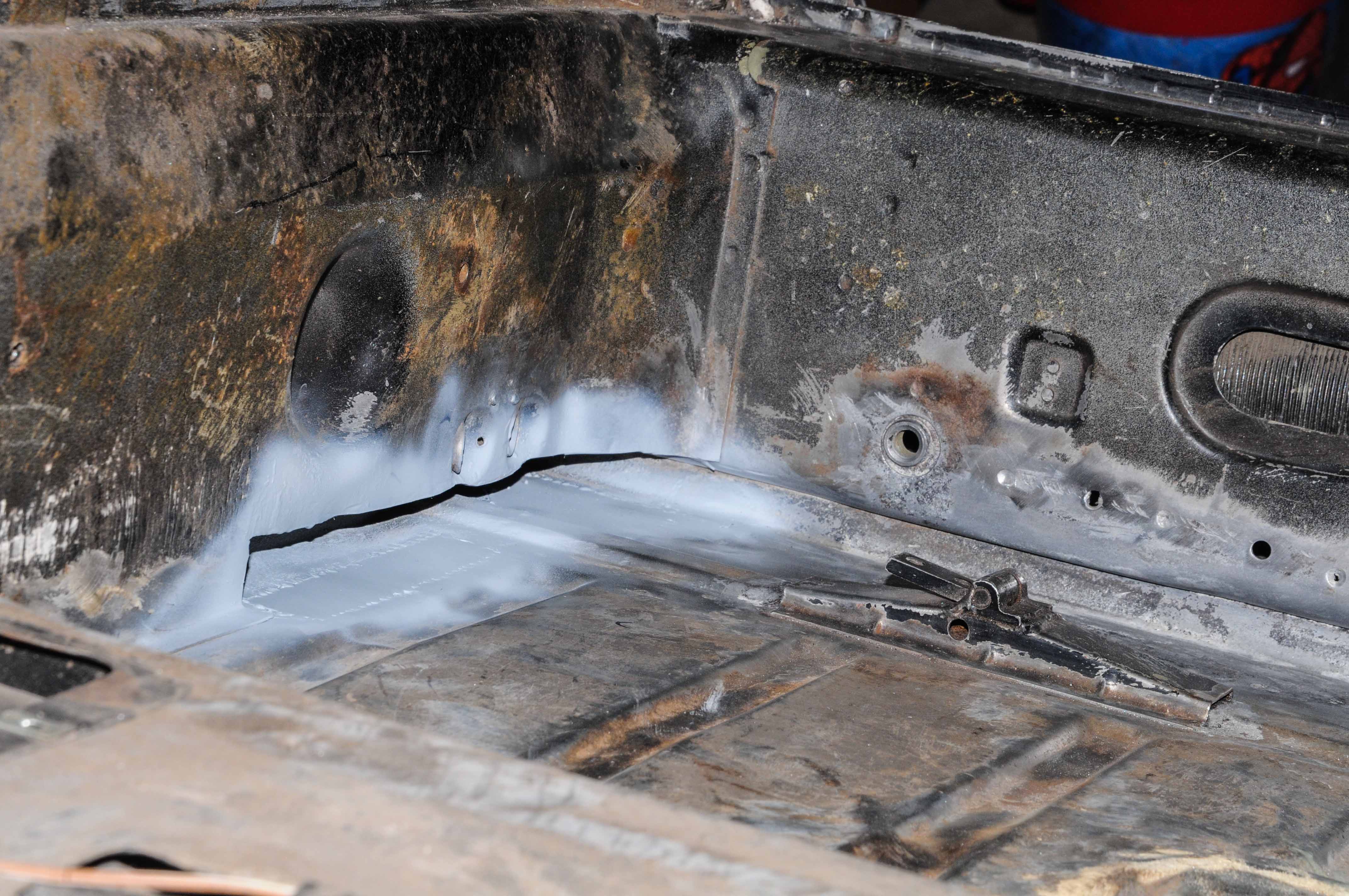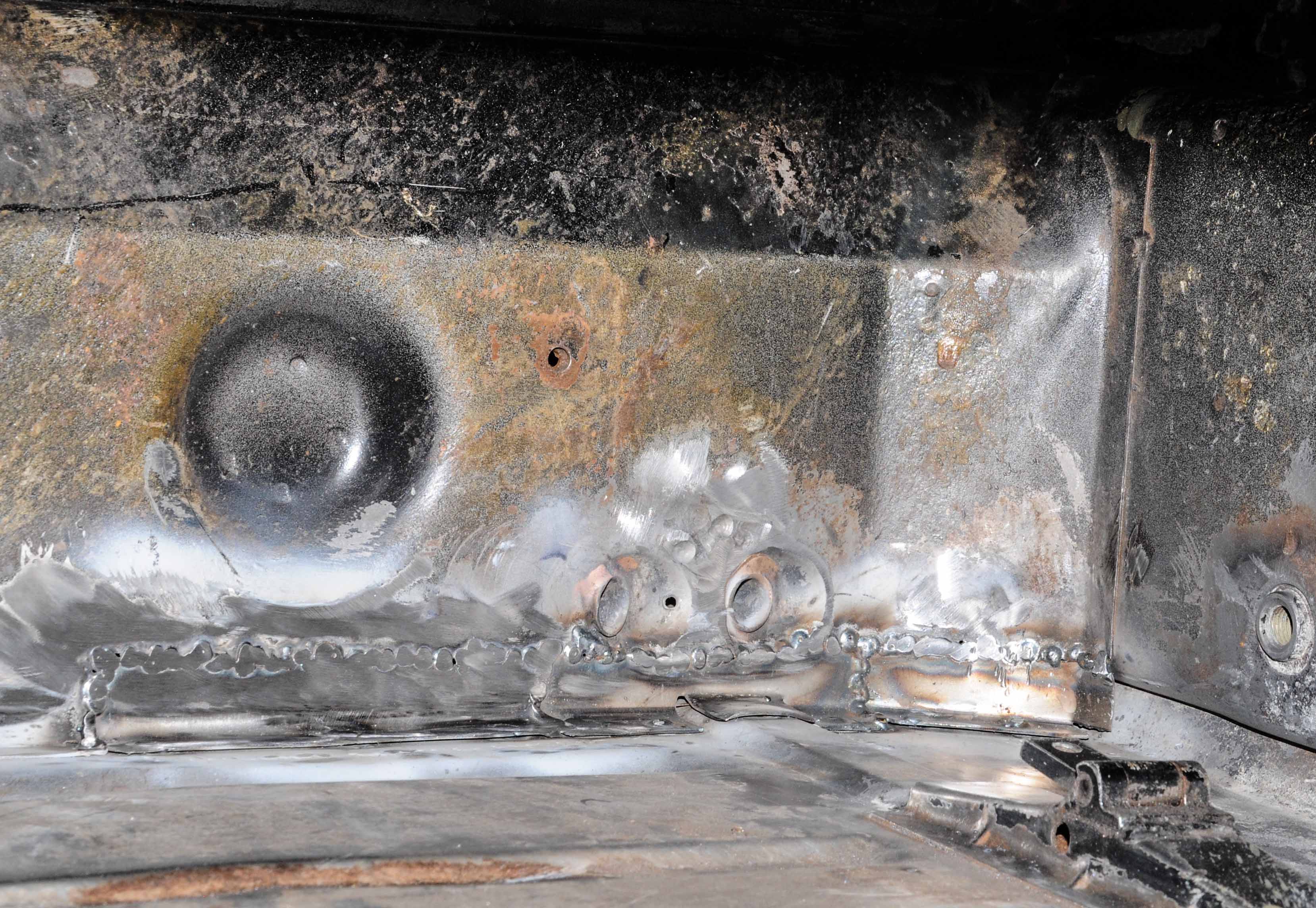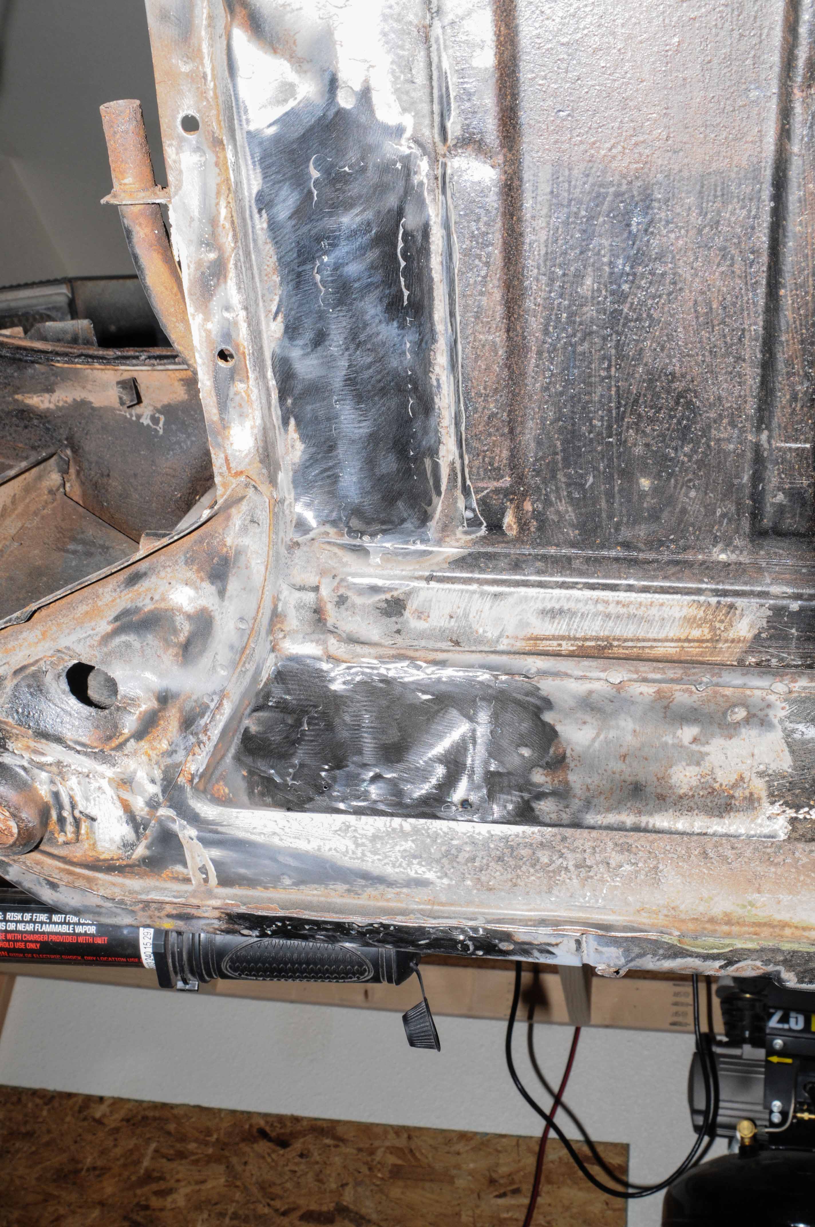 It was a really straightforward day, the biggest challenge was using scrap pieces of sheetmetal prudently. Step 1 was just cutting some metal and welding it into the holes in the floor. Step 2 was to make the 3 firewall patch pieces. 3 was the weld-thru primer. 4 welds. 5 be lazy grinding. The floor stuff was simple, and the firewall pieces weren't that bad considering I learned the tricks when I did the other side, but this side was harder since I had to work around the e-brake cable holes, and I had the floor in. At some point in the afternoon my soundtrack ran out as did my patience so I gave up on the grinding. It's a really tough area and may require the Dremel to really get the welds ground down, but I also know that I didn't get the pieces perfectly lined up so it will never be perfect. I figure I'll reevaluate next week and decide what to do...because my attitude today is thinking: "it'll all be slathered in seamsealer and hidden behind the backpad anyways..." Attention to detail, just didn't have it today. I also didn't get around to the foam removal, which considering my attitude is probably a good thing. I forgot to mention that Saturday's rust discovery resulted in also having to remove the e-brake cable guide. It's not really rusted but the stuff behind it had a little surface rust killed by the wire wheel. Attached thumbnail(s) |