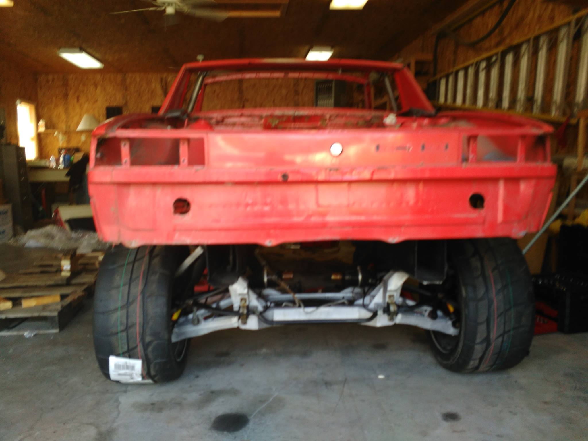 Here suspension is put this under the car to get an idea how wide it will be. I have some rust issues to take care of prior to getting suspension fit. Also want to get interior cage built and build off that. Will most likely tie in corvette frame rails as engine and trans fit inside. Need to put a bar in rear off car that sticks out about 2 inches and rear rails should weld up. Leaf springs might be an issue and will convert to coil over if that Is the case.