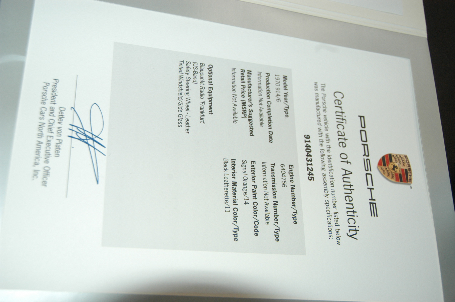 The front Valance & blacked out trim are all parts that can be had here online. Heater boxes OE, Transmission is serial numbered as a 914-6 trans, 85% Original interior. Rear truck with jack OE, front truck complete. Yes I have the Certificate of Authenticity form Porsche with Engine number listed. Car has no accidents, and has a clean Title and clean Car fax in hand from years back. Car is complete with all functions working well. Contact me lets go for a drive, The sound and the power will hit you harder than a Starbucks Expresso. Kind of hard to imagine loosing money on a 6 at this price. Have a great day. Car will likely be out Oct. 23 for the R&G swap in Riverside?? Attached thumbnail(s) |