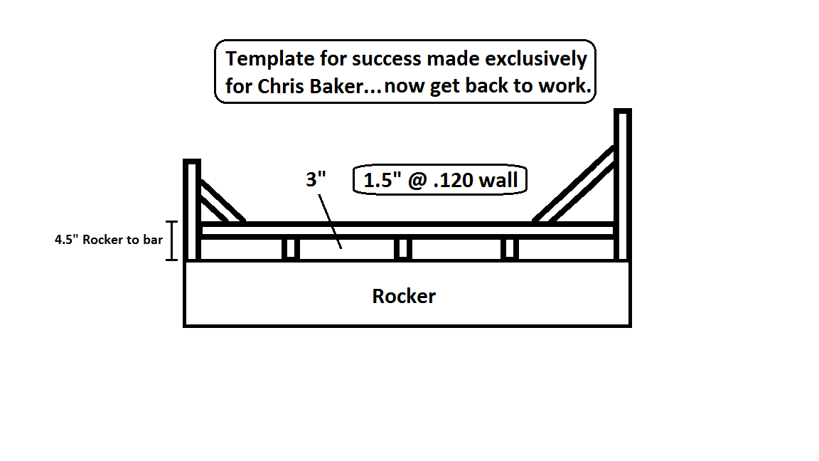 The center support is important and I would not eliminate it from the design. The gussets at each end upright are absolutely necessary and should be implemented. Call me if you need to discuss. I too will be re-configuring my cage in the next year or so - converting it to a more "hot rod" style like your car. I won't go any higher than the 4.5" (and probably even lower) from top of rocker to top of bar I've illustrated below when I do it (JMO). Keep up the good work. Tony |