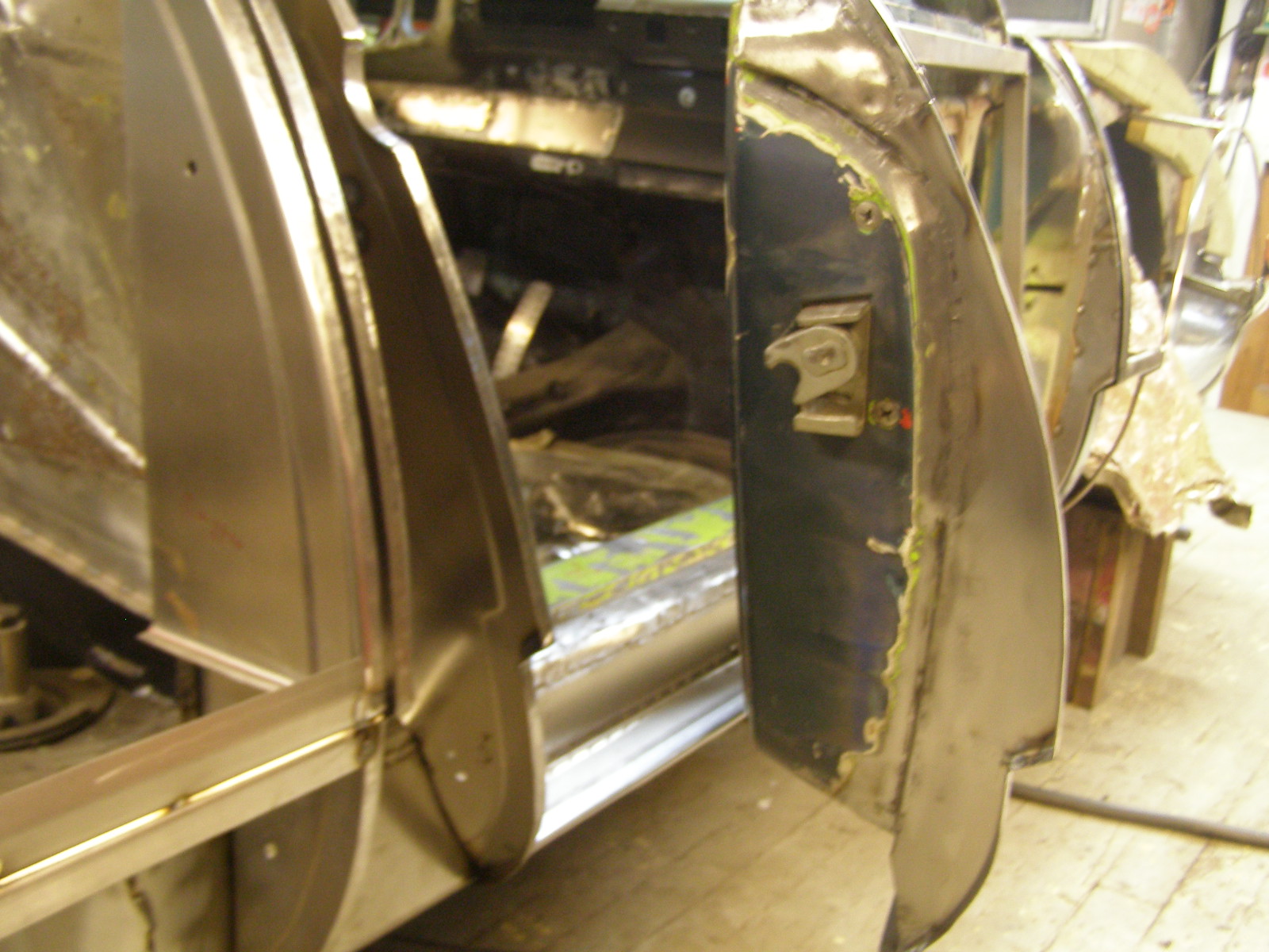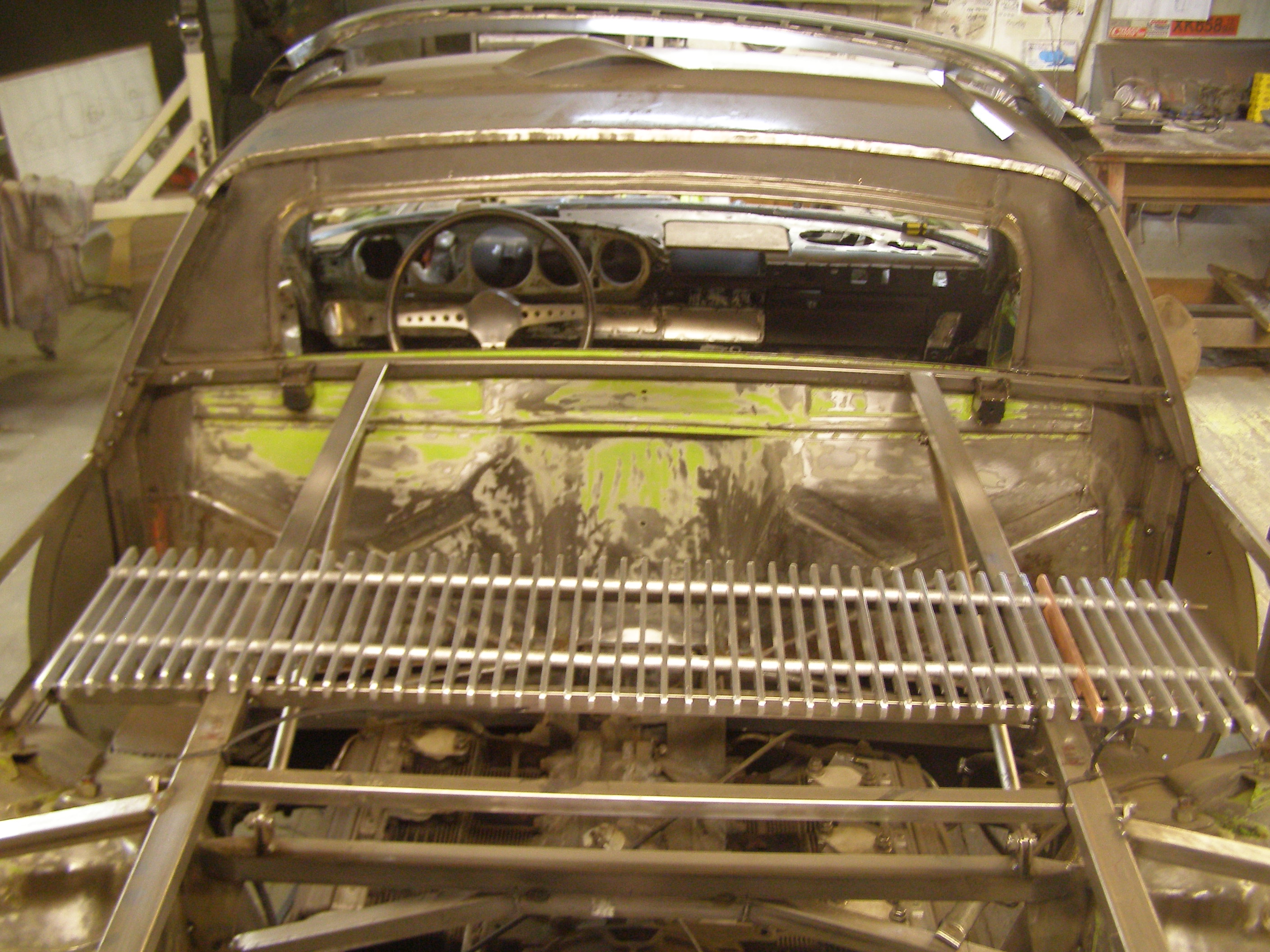929] Thanks for the comments,guys and gal.Working on door gaps today. I have a bottle of Jameson on the shelf ready for the first trip outside to get a view from a little more than 1,5 meter.If this thing doesn't look the way it should,I'm planning to cut it into three parts again... after way to much whiskey. That chunk of metal is the channel beneath the pedals that was filled with steel. Engine lid grille is made from original parts....the distances are made from 914 pushrods. Attached thumbnail(s) |