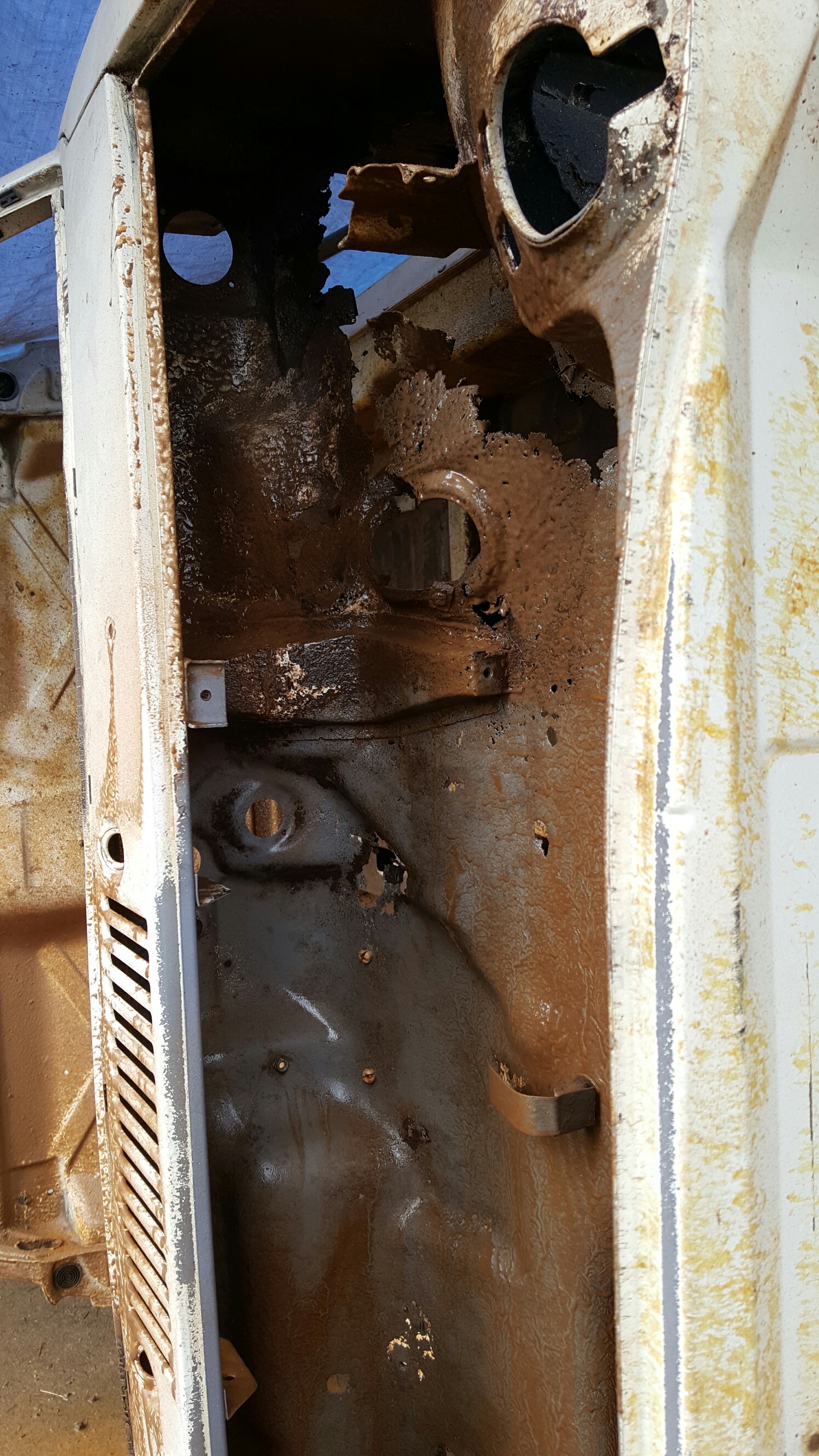 The backstory is that Wes got it in Oakland where it had sat behind a rib joint for some time. Apparently, some rodents made a home in the air box. They also acquired a taste for ribs. It appears the brought a few back with them. They were there for some time, and urinated eating the bulkhead out. The hell hole and floorboards look good. The pan is intact and looks good. He has a bunch of work ahead of him, but it will get restored back to stock ivory white. Attached thumbnail(s) |