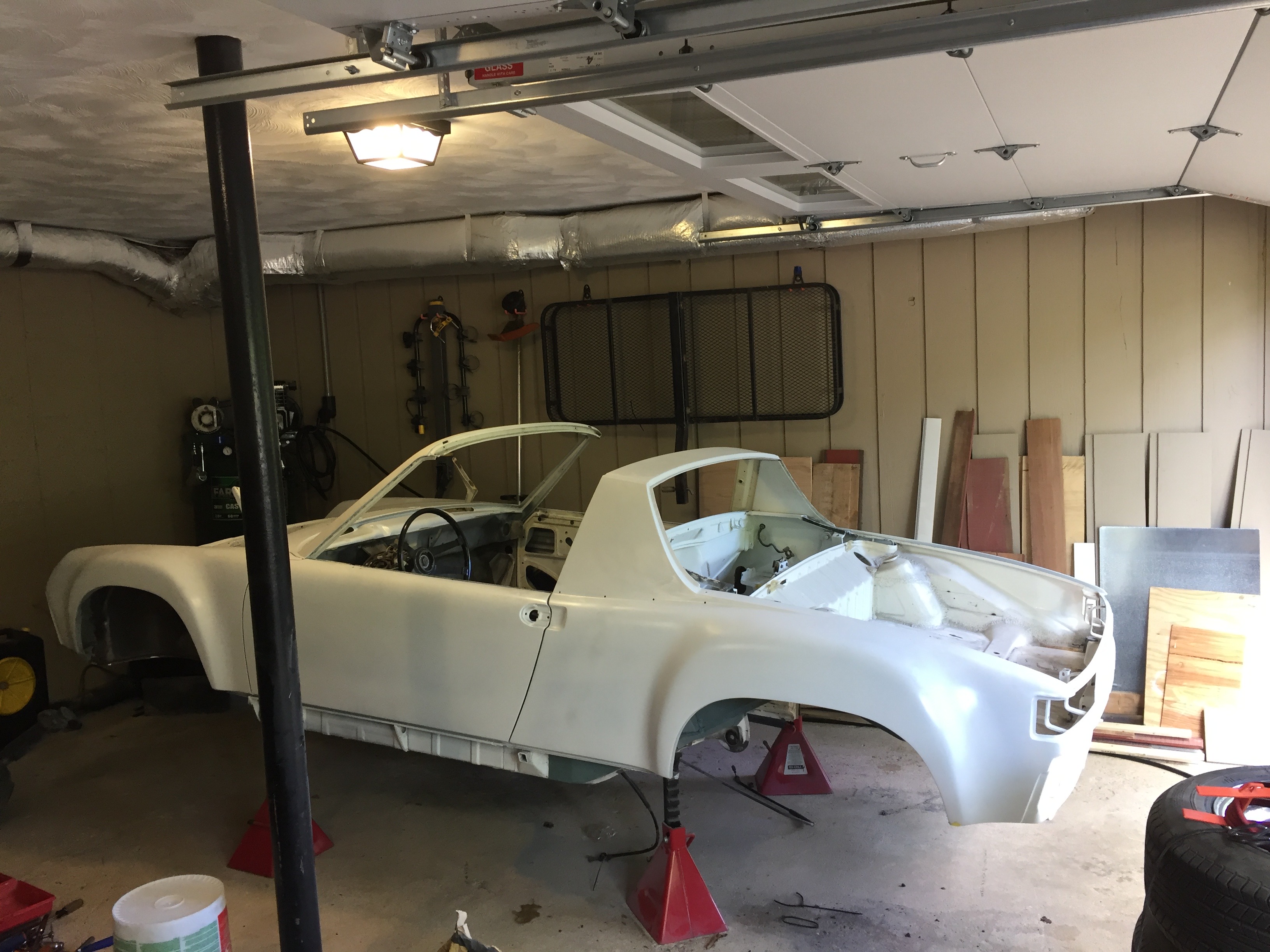 Worked on the metamorphosing 914 most of the day today. Removing the rear suspension was easier than expected; three bolts and three nuts per side. I also removed the hood and rear trunk lid, so now to get it in the air for attaching it to the rotisserie.