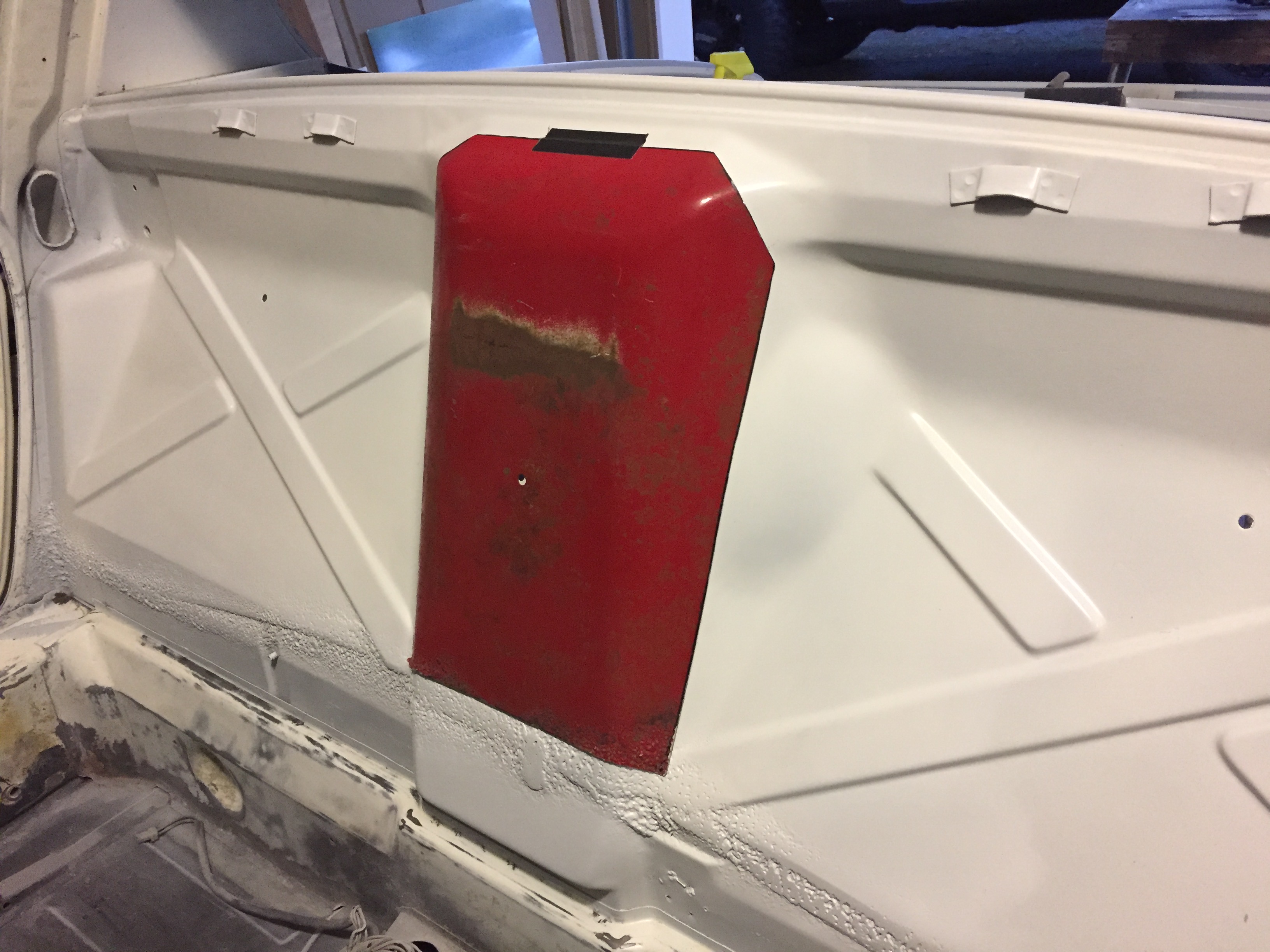 I've decided to add an access panel on the firewall. The cover will be made from a section I purchased from 914 Ecology a few days ago. I've completed the rough trim on the cover; real happy with how it turned out. |
