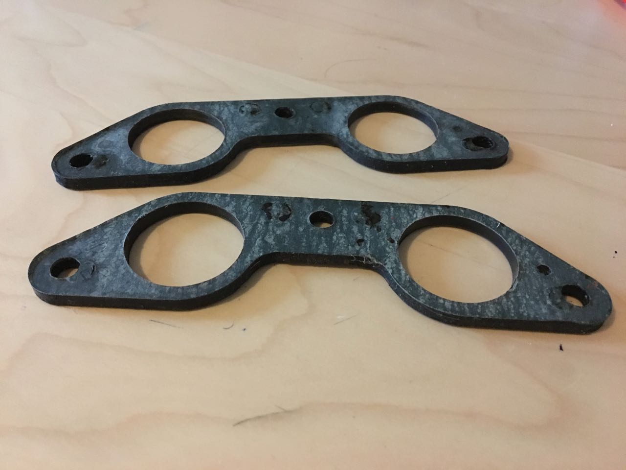 Don't reuse the neoprene gaskets. Use the phenolic (black plastic) spacers with paper gaskets attached. I found these parts amongst the spare parts the previous owner provided. Are they phenolic spacers? Also interesting: the holes on these don't match up to the carbs or manifold, and there are marks where it appears some previous owner tried to install them. |
