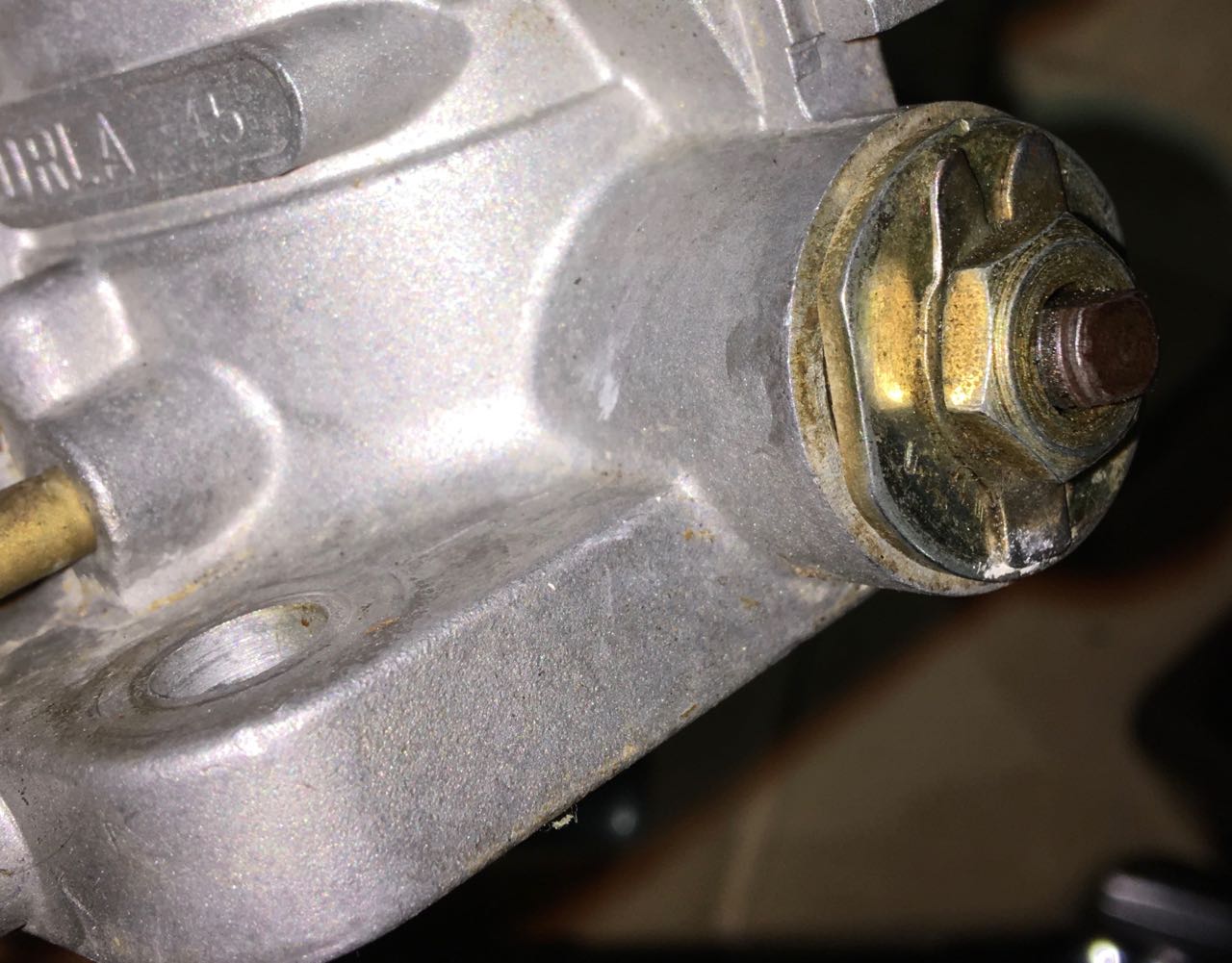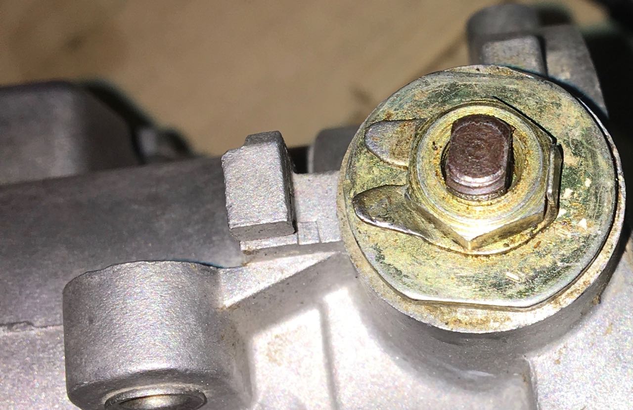 The right side was way easier since I didn't make the mistake of undoing the spring. I noticed the other (front) end of the throttle shaft had an unlocked lock tab. So I locked it. I'm curious how often these have actually fallen off. The kit for IDF had another feature I didn't seem to need, as far as I can tell. Engine compartment is much tidier without the hex bar. (I'm still wondering why there's oil spewed all around the filler.) |