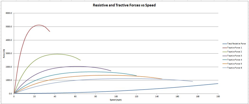 Here are my inputs. Note that the 7000 rev limiter is high. Realistically, 6500 would be a better limit point with valve spring and push rod changes for the 5.3L to live happily. ![]() I pulled my torque data from the stock graph shown here 2014-2016 CHEVY/GMC SILVERADO/SIERRA 5.3L 1500 TEXAS SPEED & PERFORMANCE L83TR-2 CAMSHAFT Plotted my points and calculated and equation ![]() Found gear ratio's for the G86.20 trans from here PORSCHE 986 BOXSTER TRANSAXLE SPECIFICATIONS Below shows engine speed in each gear. Note this is for a rear 275/40R17 tire. (flares are definitely in my future) The blacked out area's are above the rev limiter or below idle. ![]() Using the equation calculated above and the gearing for the G86.20 determined the force the tire could potentially exert on the road in each gear "tractive force". I then used the drag coefficient and frontal area found in this link... Cassidy-Online Areodynamic Aids ... to determine aerodynamic drag for the range of speeds shown. Note the drag coefficient and frontal area are for a narrow body car without a spoiler or front splitter. So realistically, I imagine the drag force would be higher. I also calculated a force induced by rolling resistance of the tire for range of speed shown. However, I feel less confident in that calculation but figured it plays a role so I included it. Below is a graph of "resistive force" (areo + rolling resistance) and "tractive force" in each gear shown in the Y axis and speed in the X axis. Subtracting the resistive forces from tractive forces gives an overall force applied to the car causing acceleration. Using the weight of the car (~2300lbs) you could come up with an acceleration in G's shown below in each gear, at each speed. Again, blacked out area's are either above 7000 rpm or below idle. ![]() It's probably worth taking all this with a grain of salt.. there are a million and one variables not included that could affect any of the above. The car probably won't accelerate at 2G's either. More likely is a smoke show and a slightly smaller tire diameter. (IMG:style_emoticons/default/aktion035.gif) |