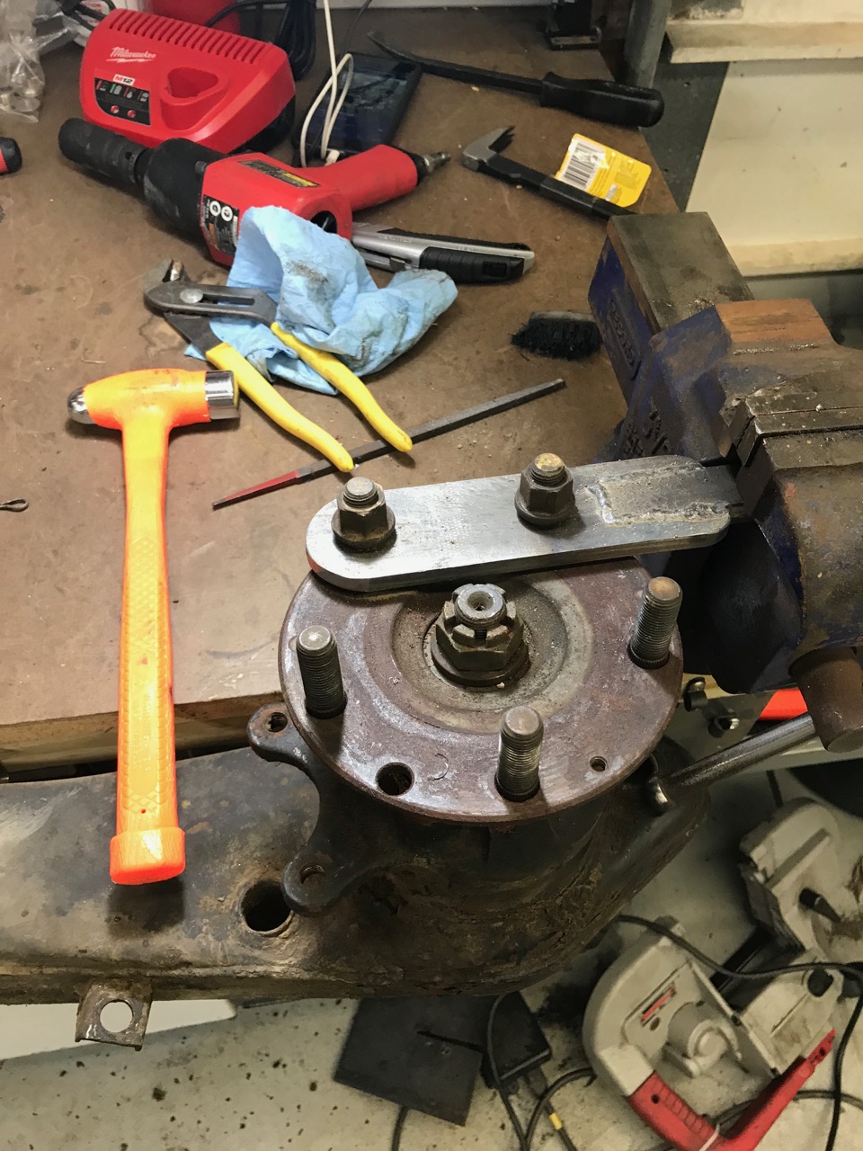 Okay so if you can't find the tool you need you make one. (IMG:style_emoticons/default/wub.gif) Rotabores Now it becomes a bit clearer what I am doing big stick driven into the flange (IMG:style_emoticons/default/smash.gif) All welded up (IMG:style_emoticons/default/welder.gif) Big long handle allows it to mount in my vice, or used on the car. For now it is being used in the vice. This is very handy for taking that nut off to remove the stub axle. More work to come latter tonight. On a sad note you see my Portaband on the floor. Using it and it slipped out of the vice and hit the floor. Carnage ensued! I need to make a mount for it to better support it while working with it. Or I need to pickup a larger floor standing band saw. Work has a couple 26" units coming up for auction (IMG:style_emoticons/default/idea.gif) Need to do 3 phase in the shop oh that opens a whole new can of worms. (IMG:style_emoticons/default/w00t.gif) Will also need to add a machine room to the side of the shop. Another 40 x 60 should do the trick. |