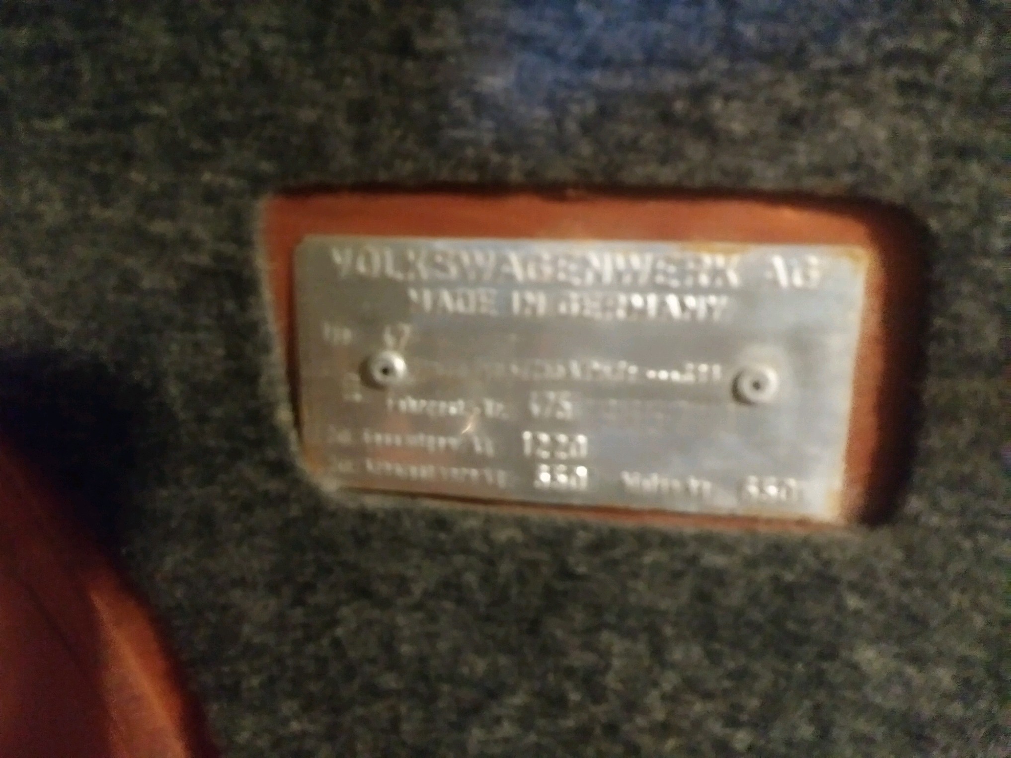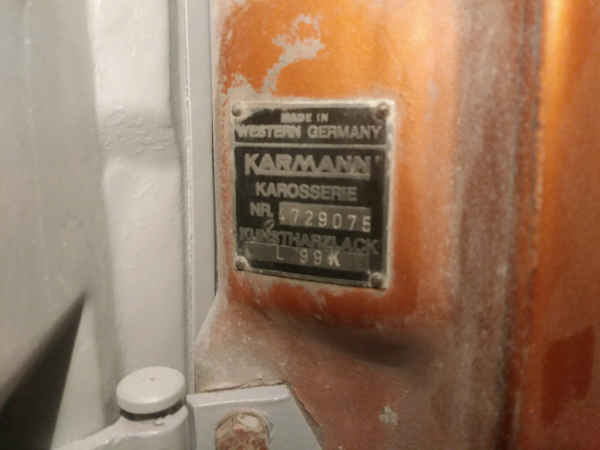 - called the Mike and he sent me pics of the karmann tag and front trunk tag but he did not see the door jam tag in the car and i didnt find it in my center console box or the manual - hope it turns up for now its "misplaced" - makes me kind of sick to know it was there nad had been for past 9 years and i wasnt more careful stripping car down last fall- or i was and put it somewhere safe and dont remember where, ugh makes me sick! here is tag in front trunk, and the Karmann tag from front door jam Attached thumbnail(s) |