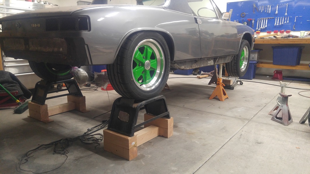 I found my floor has a slope side to side at about 3/8 of an inch. If I use some left over 3/8 bamboo flooring on the drivers side it gets me level side to side. For the back I used a couple 4x4 screwed together and then screwed the ramp stands to it in the back. I dont have any more ramp stands for the front, so I used jack stands at the forward lift points and then a single jack stand at the front trunk floor. Its mostly level, I need to drop the drivers side rear coilover a 1/4 of an inch or so. I will do that tomorrow. What do you all think? Attached thumbnail(s) |
