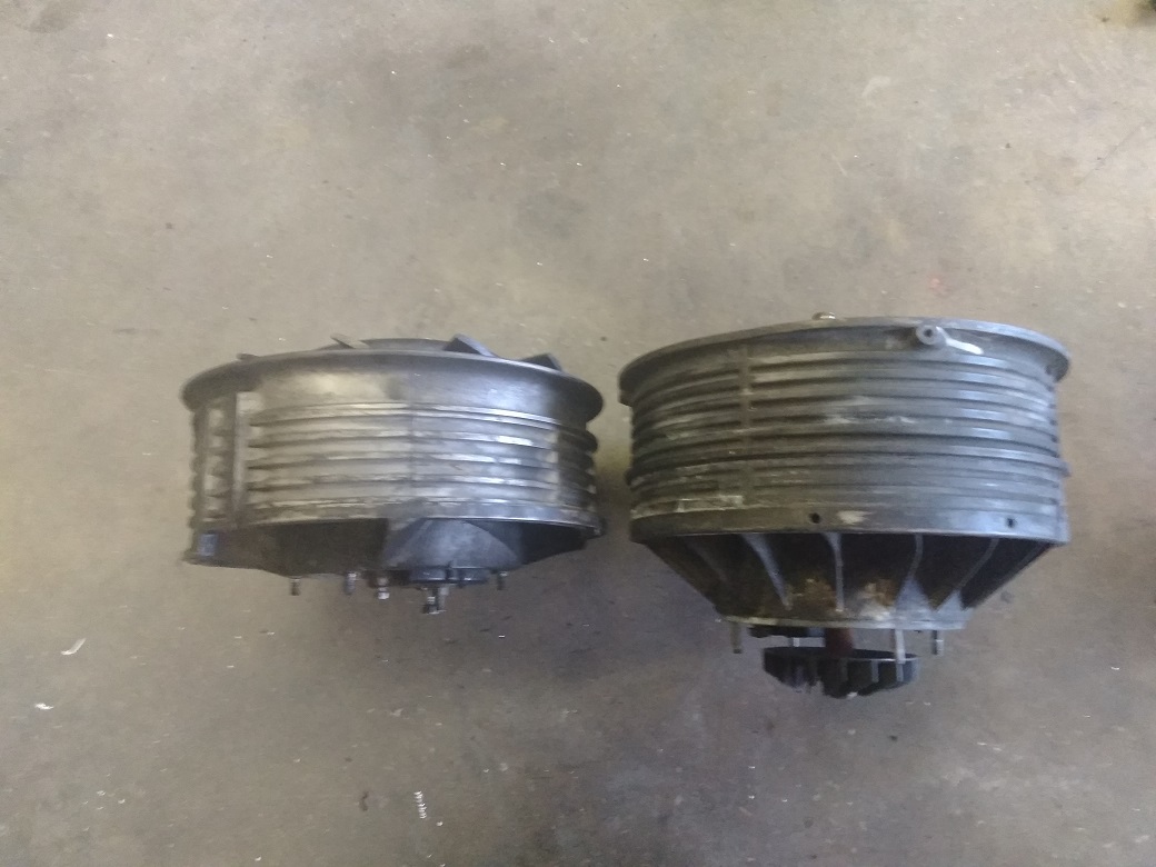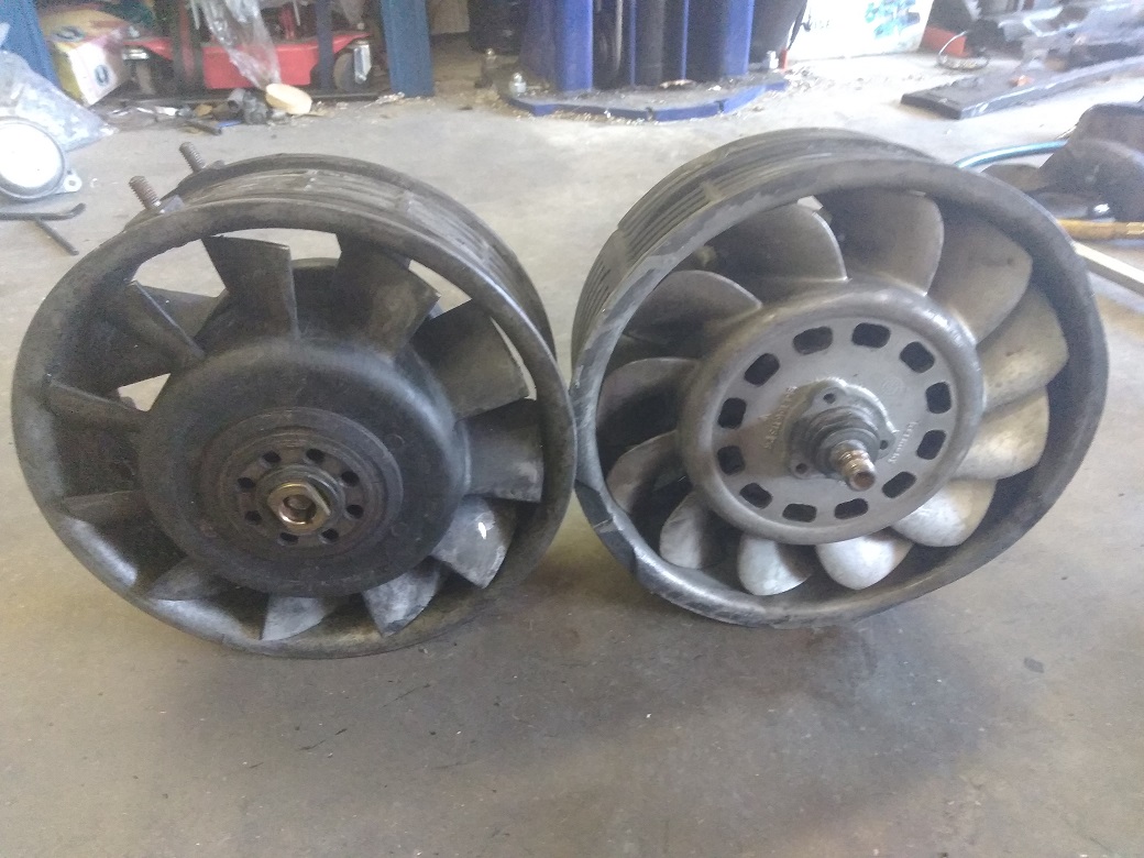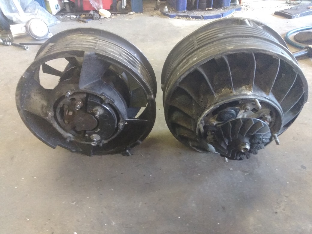 Here are some pictures of a factory 914-6 alternator and fan compared with a 964 alternator and fan. As you can see, the factory 914-6 alternator/fan assembly is smaller in diameter. The last picture really shows off the size difference. The little fan on the back of the 964 alternator is there just to keep it cool. I actually tried to fit the 964 alternator in the 914-6 fan opening. Its too big. Your aftermarket alternator looks like a great solution for early cars with electric AC compressors. I suggest you get the serpentine belt kit from Clewett engineering if you use that alternator. Besides the ability to handle more load, it makes the belt easier to change too. |