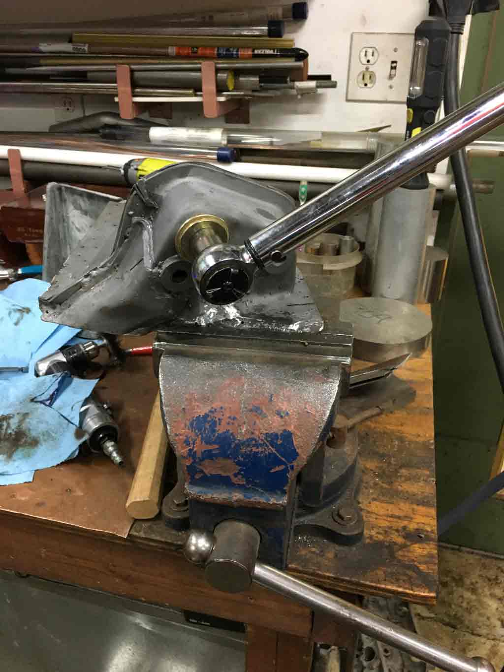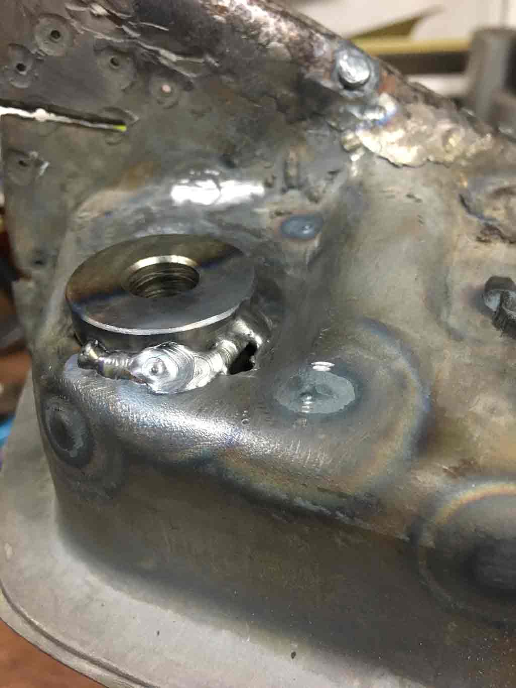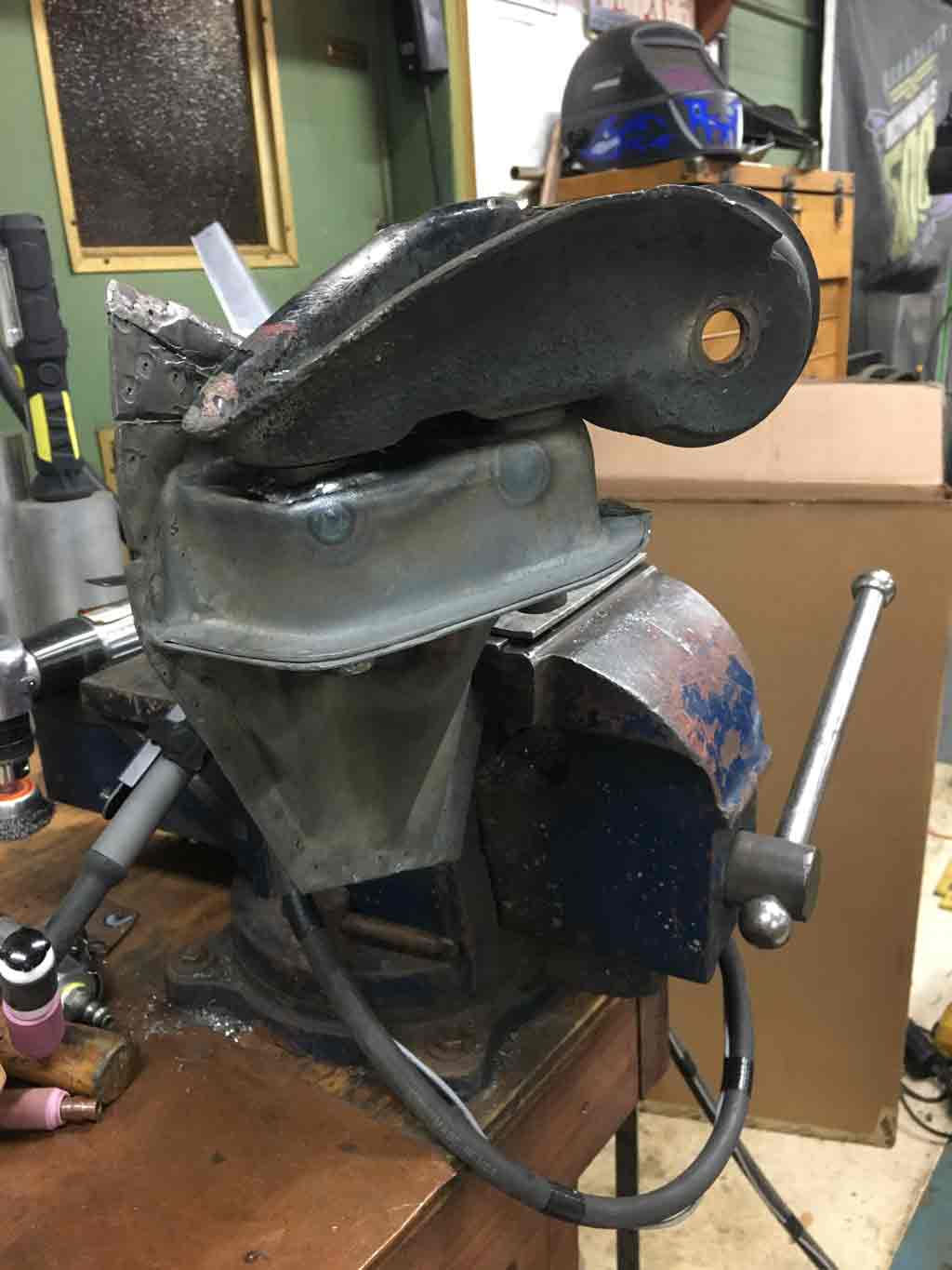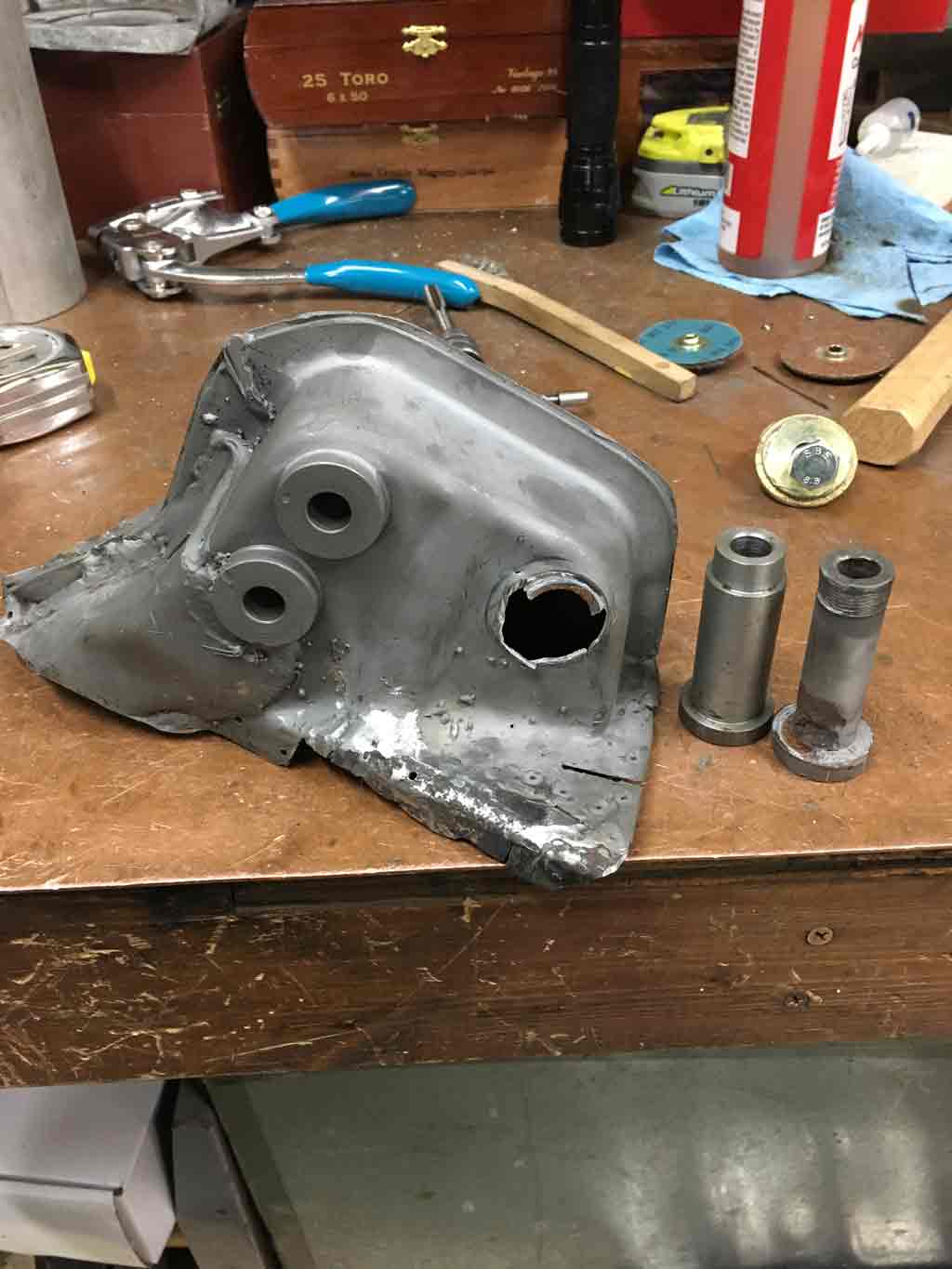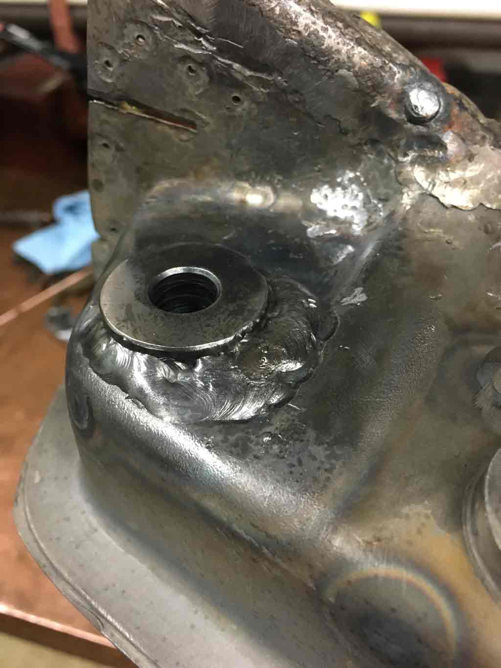 This lead to me ordering a bobbin from Tangerine (Did I mention they are a great vendor (IMG:style_emoticons/default/first.gif) ). First I cleaned up the other two holes with a tap and Proof Torqued the fasteners to make sure they were sound and would hold torque. It would be really crappy to find out later after welding the console mount that one was weak and would strip. Putting it in the new bobbin took a bit of time. However the one thing I can say with absolute certainty is that this was much easier to do on the bench. I wouldn't look forward to doing this under the vehicle Started by removing the bad bobbin. The new bobbin is on the left. Since my outer console mount had some metal loss on the floor of the mount, I decided to put in some new metal as reinforcement. Had to do a little pattern development. ![]() Welding in the reinforcement I also ran into a little problem where the new bobbin wasn't at quite the same height as the other two. It was maybe about 3/32" too low. I used the old trailing arm outer pivot to serve as a datum. By tightening the other two bolts first the third can then be pulled up to the right height. At that point I began tacking and final welding. I also predictably ran into some issues blowing holes into the thin pitted metal that was previously reinforced. Patience . . . and TIG welder really helps with this. All in all things turnd out to may satisfaction. Next step: Gotta get this located properly to the inner wheelhouse panel. In my case, since I didn't cut the outer quarter panel for access, it needs to be welded to the panel before I weld in the wheelhouse panel. |