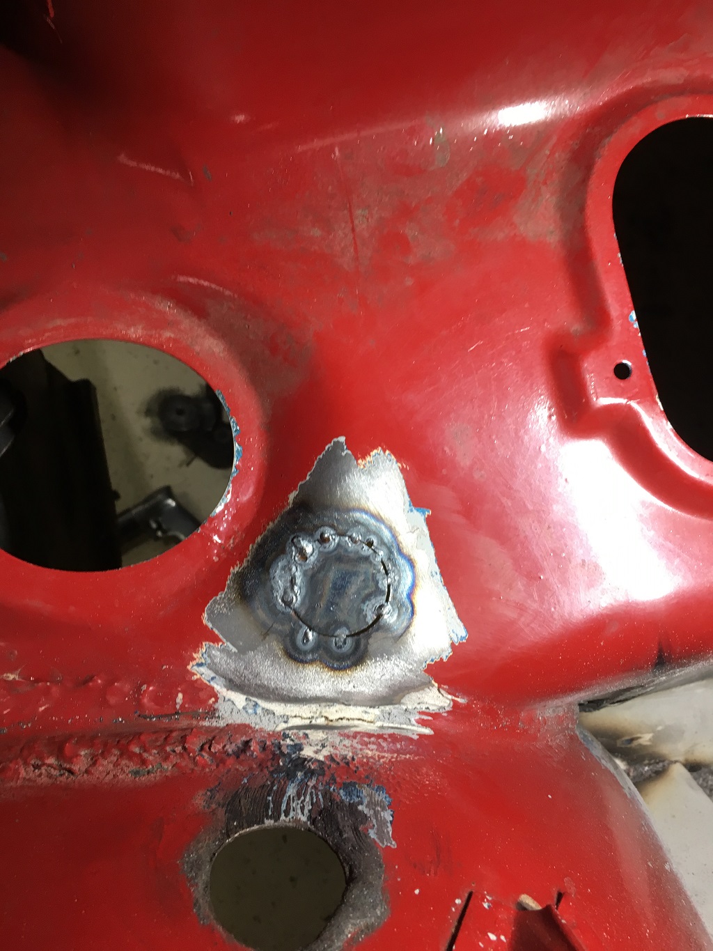 Nothing leads to rushing more than being uncomfortable. The other key thing is that is worth repeating is you can't weld what you can't see. some positions that I was forced into obscured my visibility to to the weld puddle. Not being able to see the puddle is a great way to let it get too hot and to burn through. To top all this off, my cowl area has an abundance of holes (other than rust) that needed to be fixed. 1) A/C holes were cut for lines to pass through. 2) Sheet metal screws were randomly punched though the cowl area to support the A/C unit itself under the dash. 3) whenever a previous owner wanted a ground connection, they just shot another screw though the cowl. I've started to address the large A/C line holes. The only problem here is this is overhead welding. Even more fun! These holes are tucked right into the corner of the cowl & fender area. I tried to weld this in from above but my welding helmet prevents me from getting my face in a good position to see the weld puddle. You can see this by the tack weld at about the 7:00 position of the hole -- completely missed the weld gap! Cannot weld what you cannot see! . I resorted to doing the other tack welds from inside the passenger compartment and from below. I don't like this solution. I think my next try will be to use a gas lens and hang my Tungsten as far out as I can hoping to get better visibility to the weld. Trying to be slow and patient and find the best welding position to do this. If I start blowing holes in this area I'm screwed. |