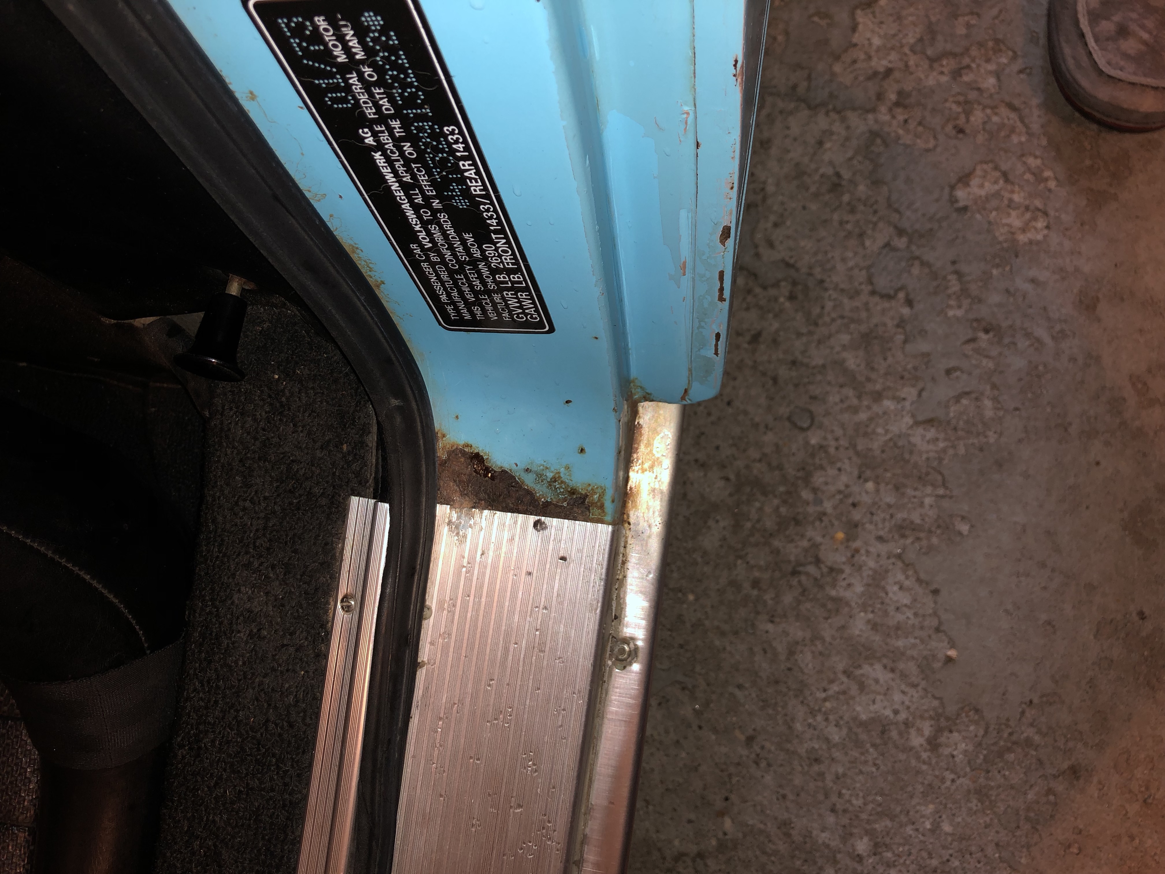Thanks for the feedback so far. Here is a pic of the door sill area. Due to the size of the files, I'm being limited to I pic at a time. The fenders and front trunk area look great with only minor surface rust. There is some rust inside the back of the rear trunk floor with a couple of tiny holes (not the drainage holes).