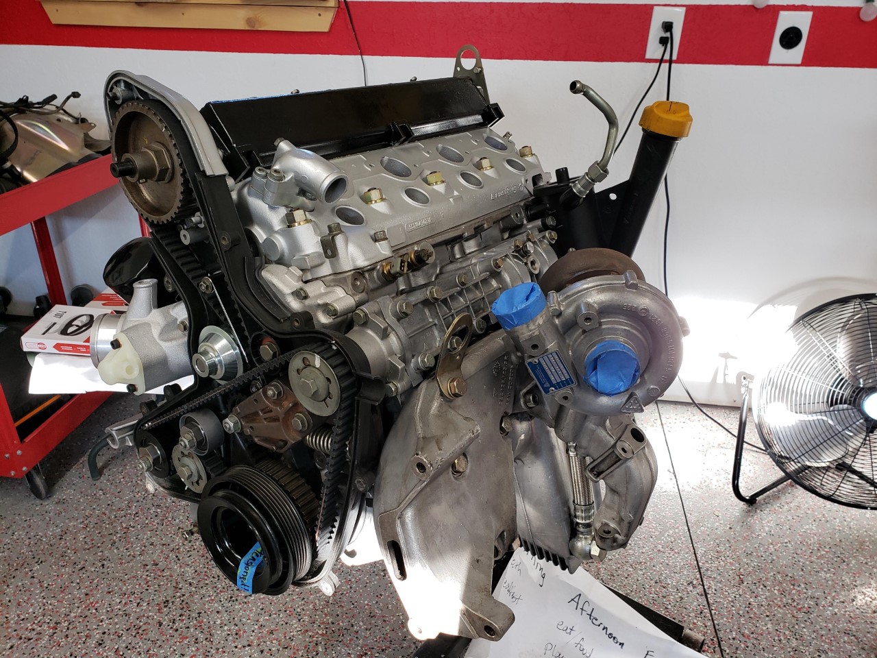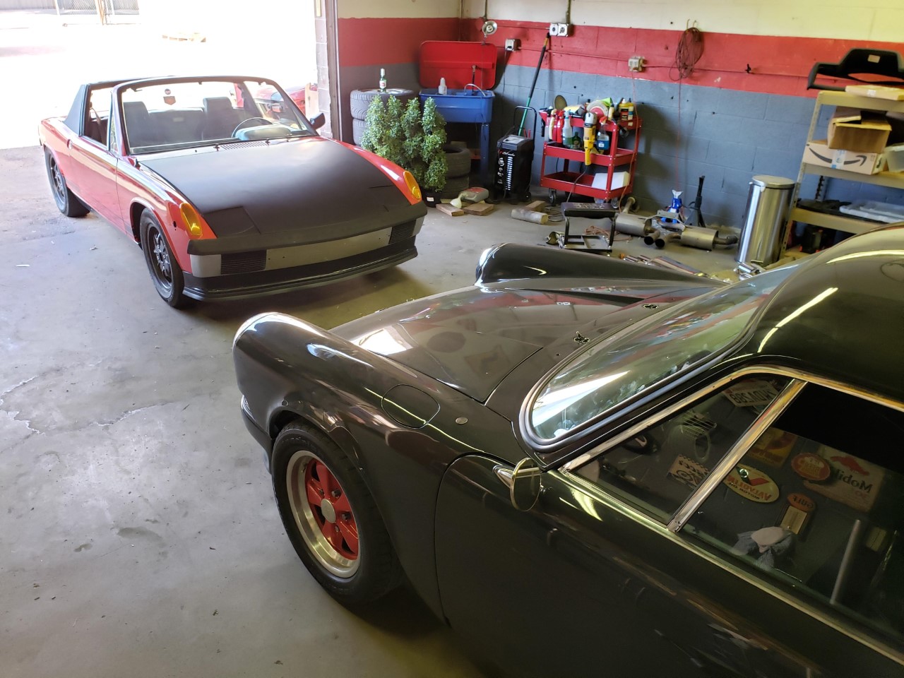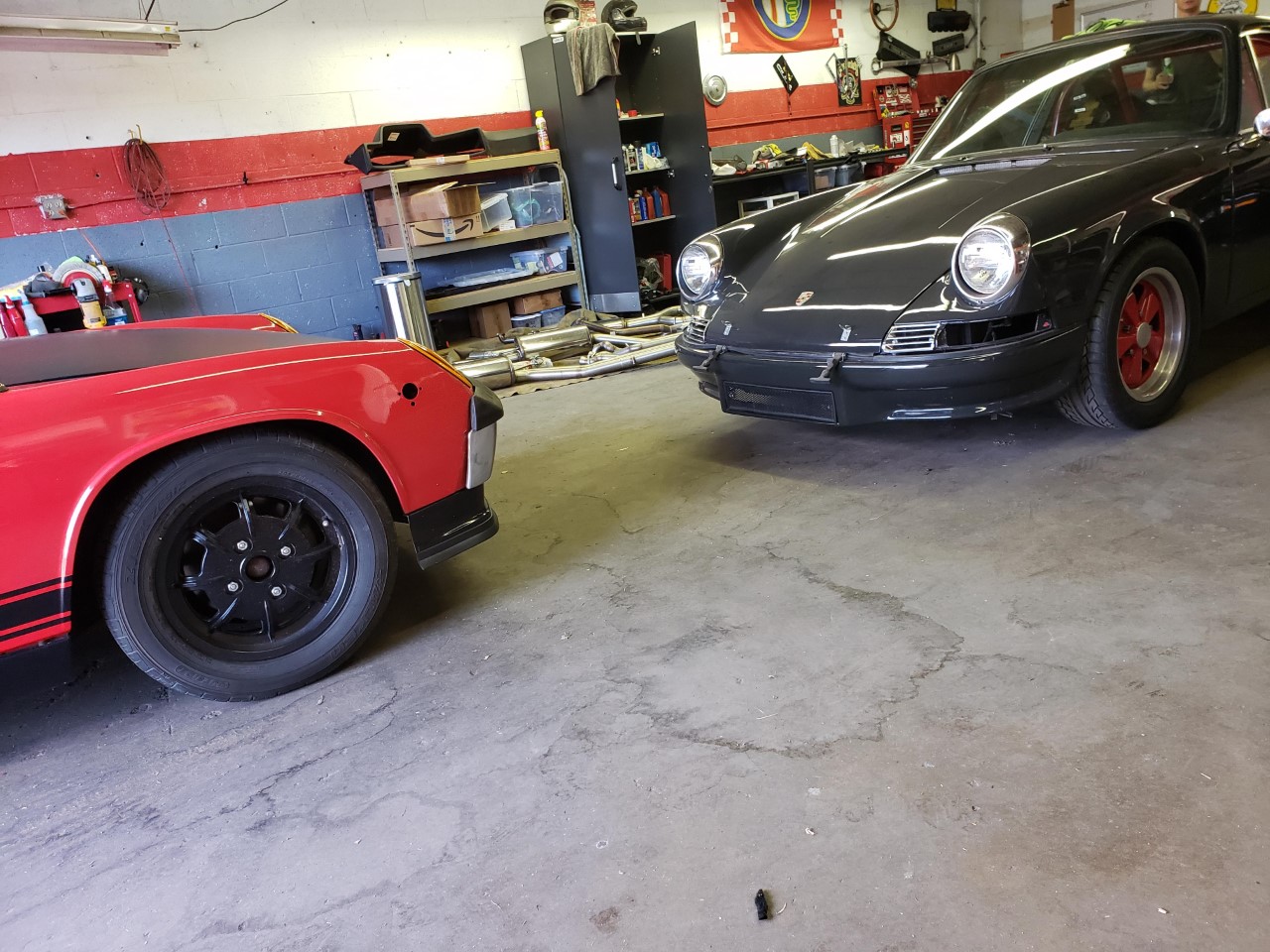 I never even noticed Scarlet Red in the paint codes. It looks great! I understand the need to keep the budget down. Drive it now, and make it perfect later. Thanks. I admit it's been a challenge to keep things from getting out of hand. I want very much to do a full restoration/build on the car, but it's just not the right time. So, the story goes on, of course. I had gotten the car to the point we see above. There were still plenty more things to sort out, but I was feeling pretty happy with the progress. Then, one day while trying to sync up the carbs, I found a wire that had come disconnected near the coil. It was sparking every time it hit metal. I messed around trying to figure out where it should go, but everything I tried resulted in a no-start. It was about this time that I had pulled the motor from my 87 944 Turbo for a complete reseal, clutch, rod bearings, and turbo upgrade. Feeling frustrated with the 914, I tucked it out of the way in garage. That was about six months ago. Now the 944 motor is almost ready to go back in the car. Gratuitous photo, because you know, "pics, or it didn't happen": But recently, I had been thinking about why the 914 wouldn't start, and I decided that maybe I fried the electronic ignition module in the distributor. So a couple of weeks ago, I ordered a new one just to see. Last weekend, I got it in the mail, charged up the battery, installed it, and what do you know, it fired right up. I had to take it for a little drive to surprise my brother down at his shop. Here it is with his recently slate grey painted 69 911: |