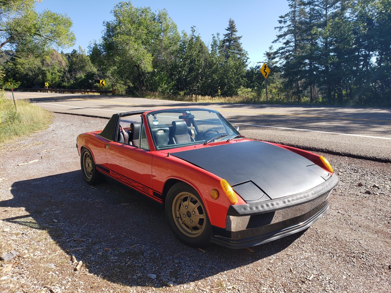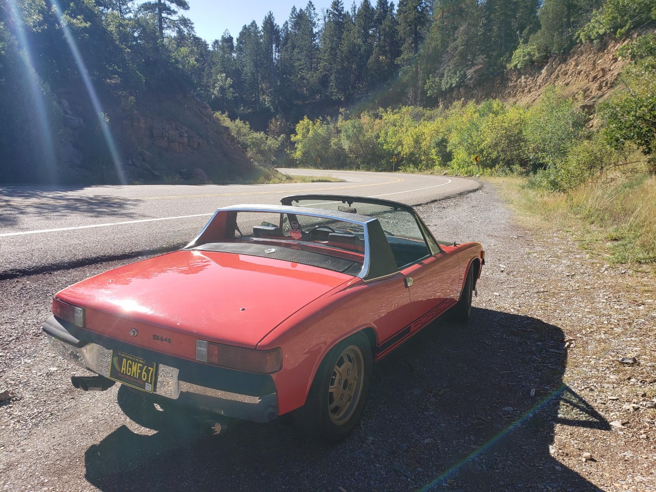 Shifting into first and reverse was just driving me crazy. This morning I adjusted the clutch cable this morning, moving the release point higher for the pedal. I will adjust it back a touch, but it's much improved. So, I took one of the longest drives I've done so far in the car, heading out to the foothills east of Albuquerque on a tight canyon road, then up part of the Crest road in the Sandia Mountains. The old 914 was doing well and loved the cool mountain morning air. It was lovely threading it through all the turns on a nice smooth road with that raucous type 4 bellowing away! |