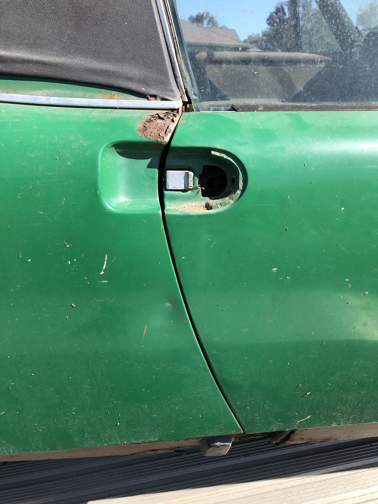 THIS is the sort of door gap that spells near certain death for our little cars. This one is literally folding in half due to rust that's essentially disappeared the longs.