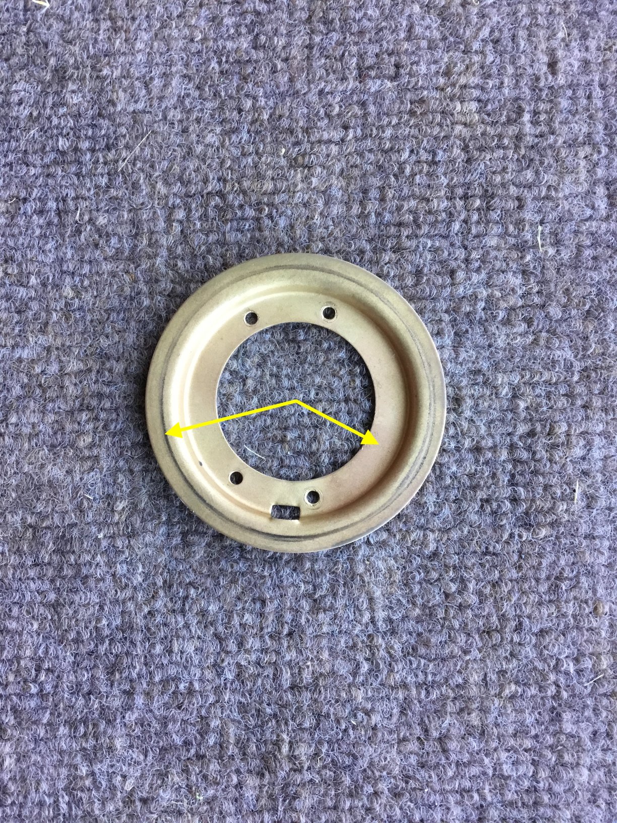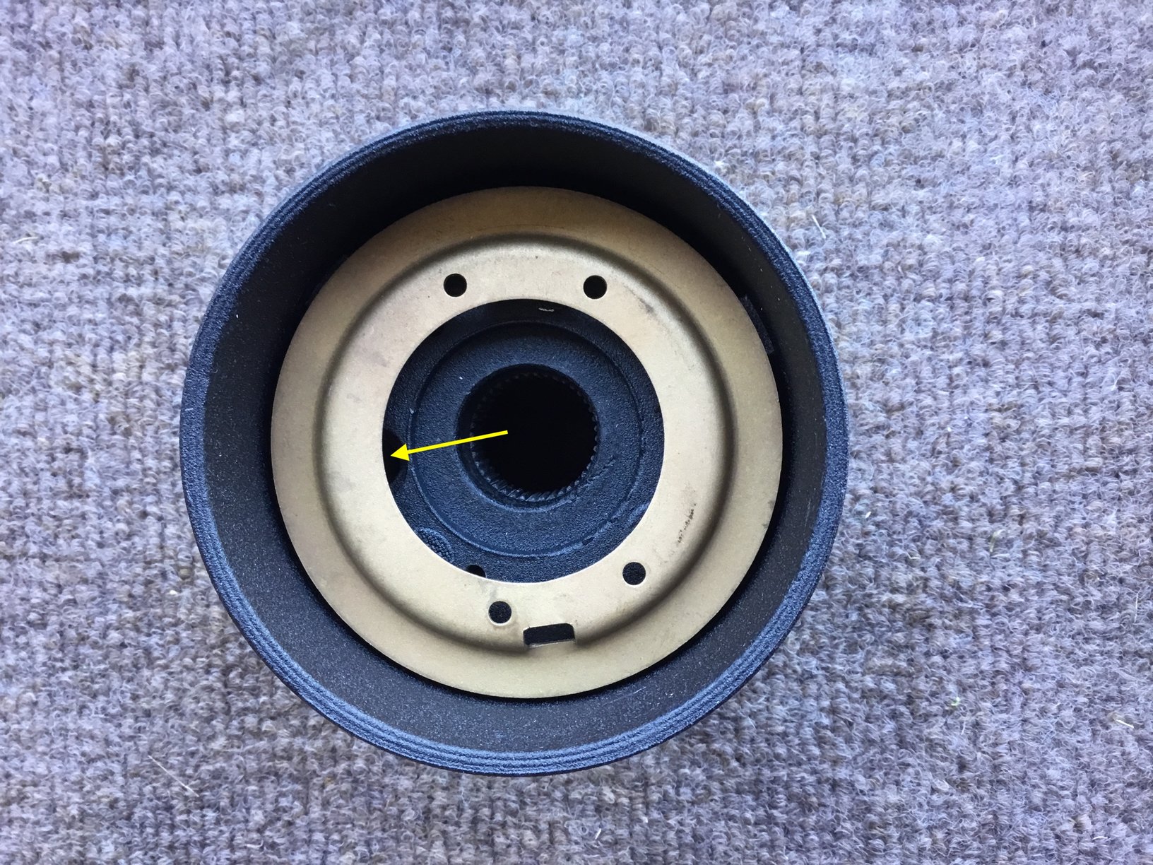 You can see where the factory pin rides up on the most out part of the ring. With the Luisi placement, the horn contact pin would ride in the same area where the 4 holes for the screws reside that hold the contact ring into the steering column. You'd either bend or break off the horn contact ring as you turned the steering wheel when the pin would hit the heads of the screws on the contact ring. Or you might not even be able to turn the steering wheel as the contact pin hit the screw heads on the contact ring. Not a good thing in either way.... You can see the issue in the below pic. The location of the contact pin is not far enough from the center of the hub. In fact, you can see the hole just peaking out towards the center of the hole of the contact ring (yellow arrow). |