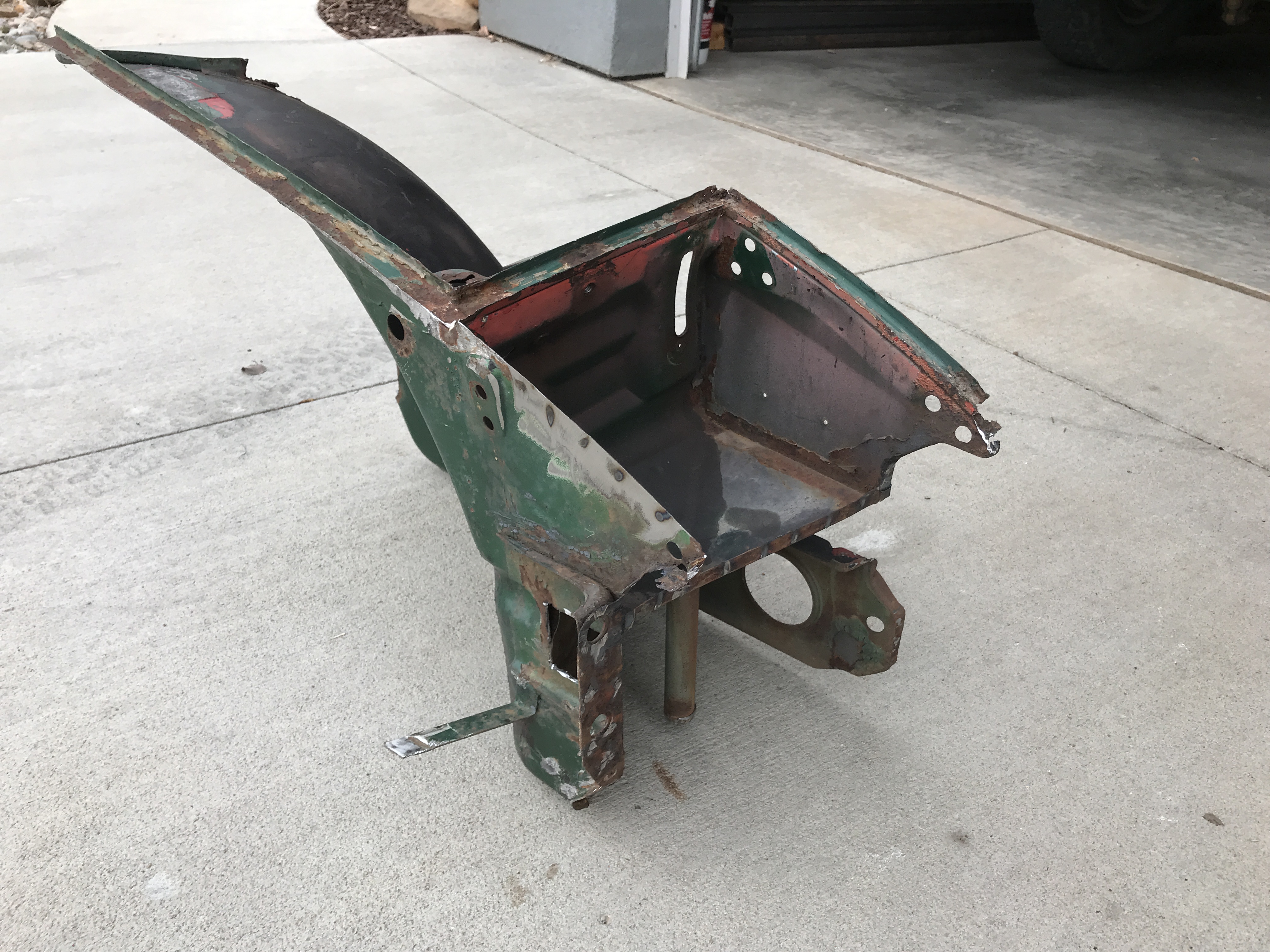 Donor part down to inner fender, headlight box, and vertical brace. I need to repair some local rust but will wait until I cut and fit the fender wall splice. Attached thumbnail(s) |