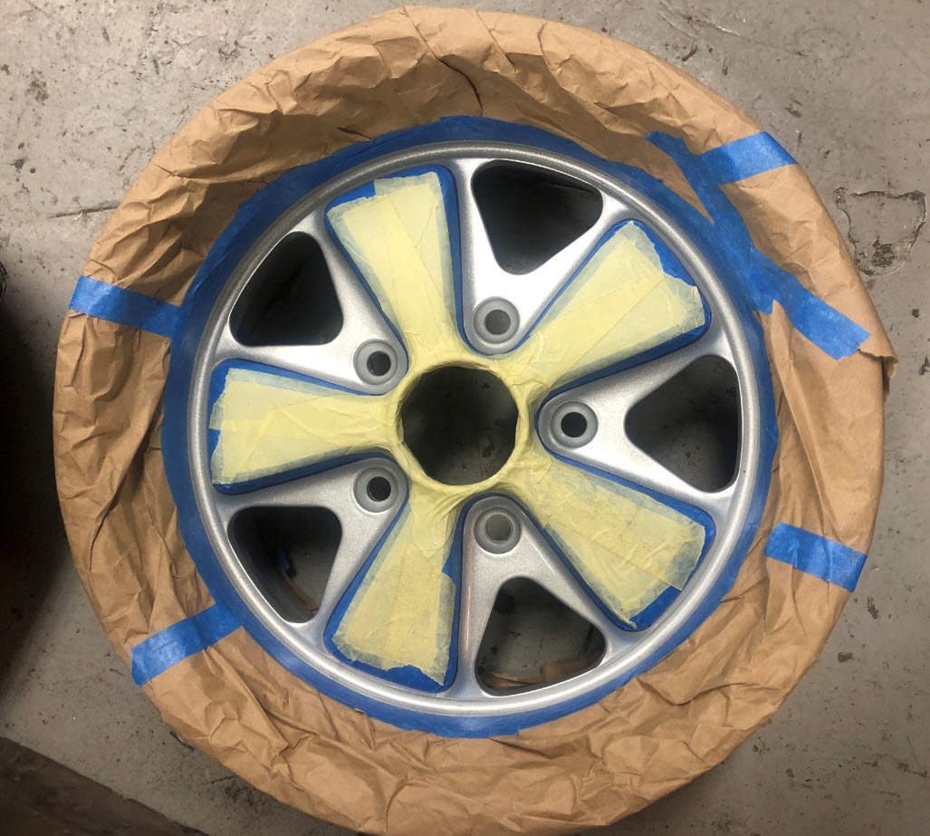 bought some 8x15 fuchs wheels some time ago. They were painted and had some pitting, but otherwice guite nice. I got them stripped and powder painted in the same finish as the rear 9x15 minilites. They were not possible to restore "properly" with anodized surface bechause of the pitting. I did the black detailing myself. Started doing the masking by hand, but was not sucessfull (IMG:style_emoticons/default/hissyfit.gif) , so I made a part I could draw a help line with. Line Then I used thin masking tape and followed the line. And some more masking.. ![]() And painted with 2K satin black. ![]() Exciting moment Glad it was only two though. ![]() The rear Minilites |