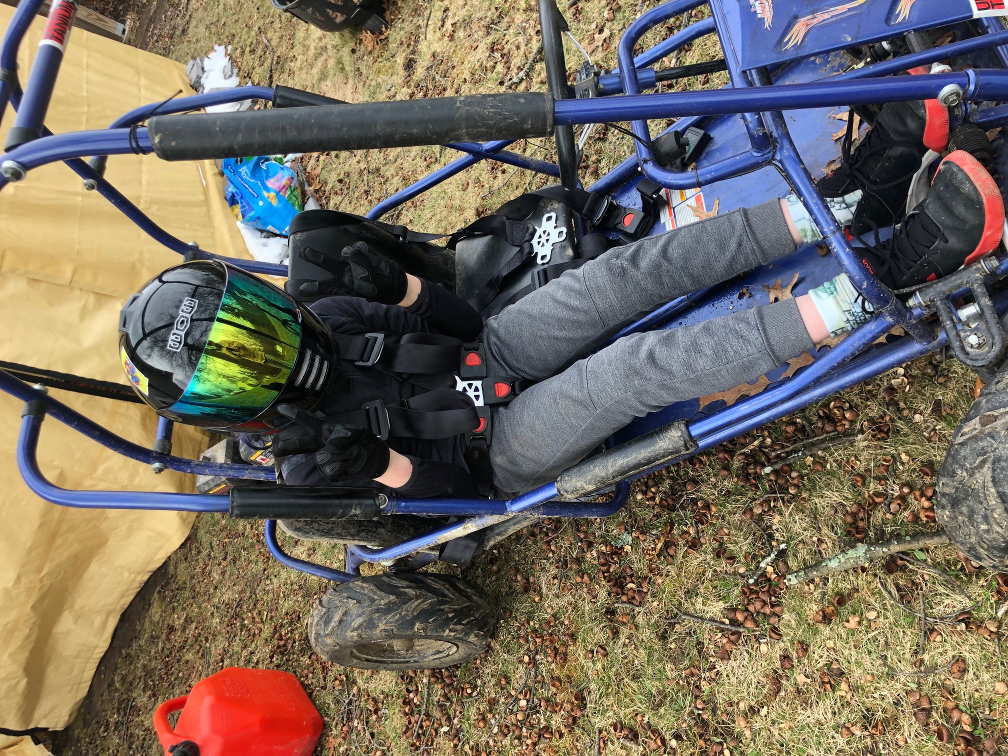 It finally stopped snowing and warmed up outside so my son Max and I installed the 5 point belts in his go-kart, and he did his first solo run. It was a good day.