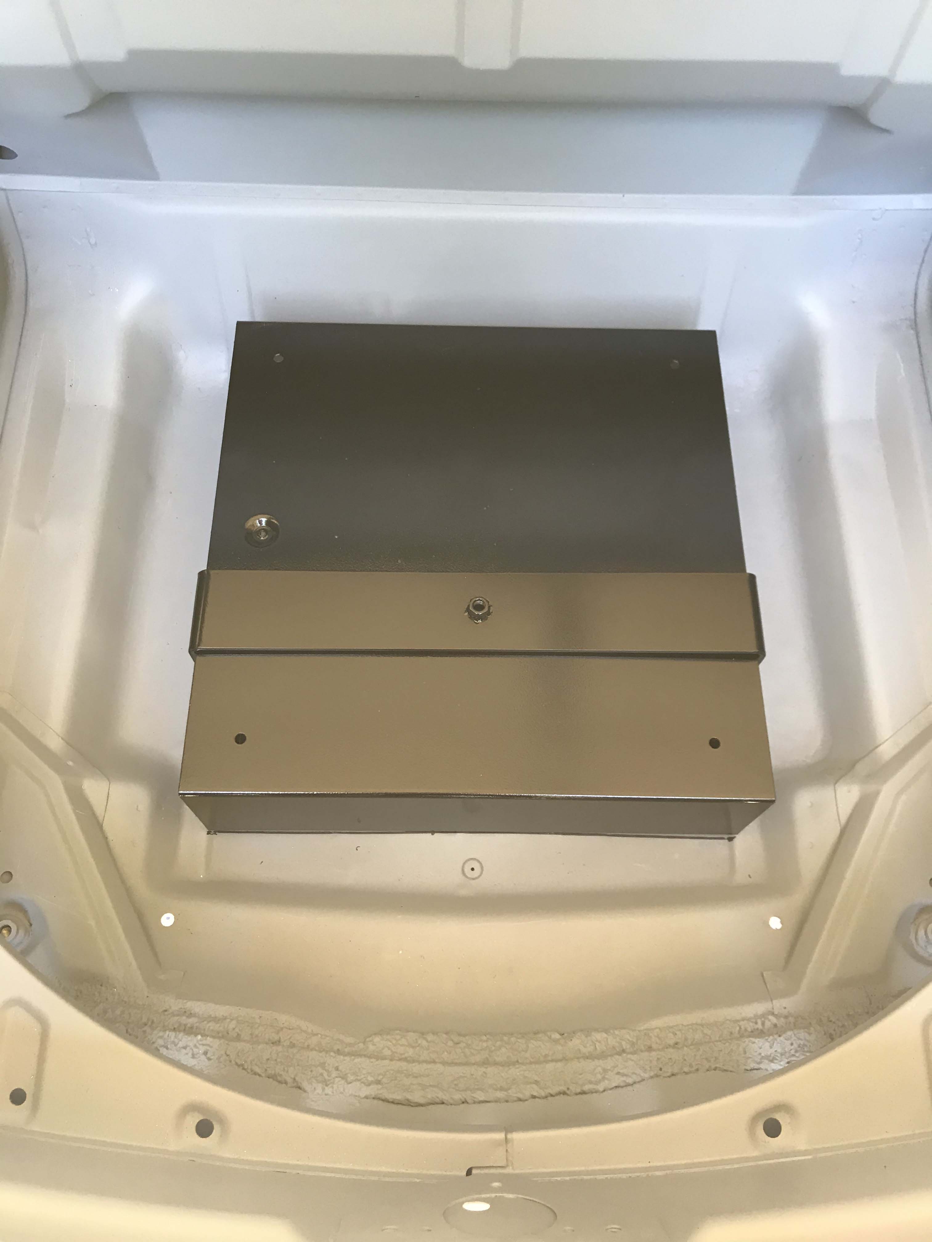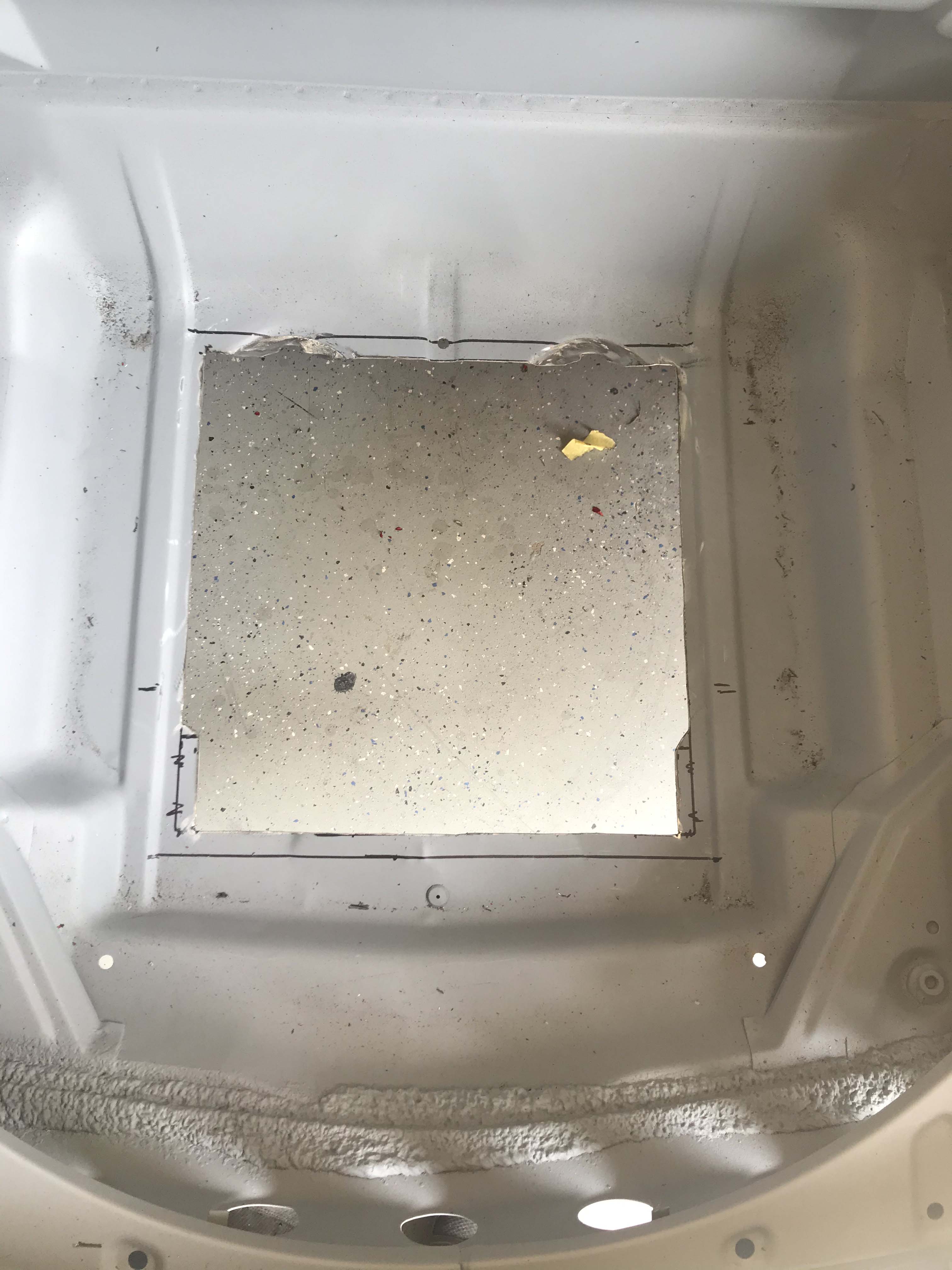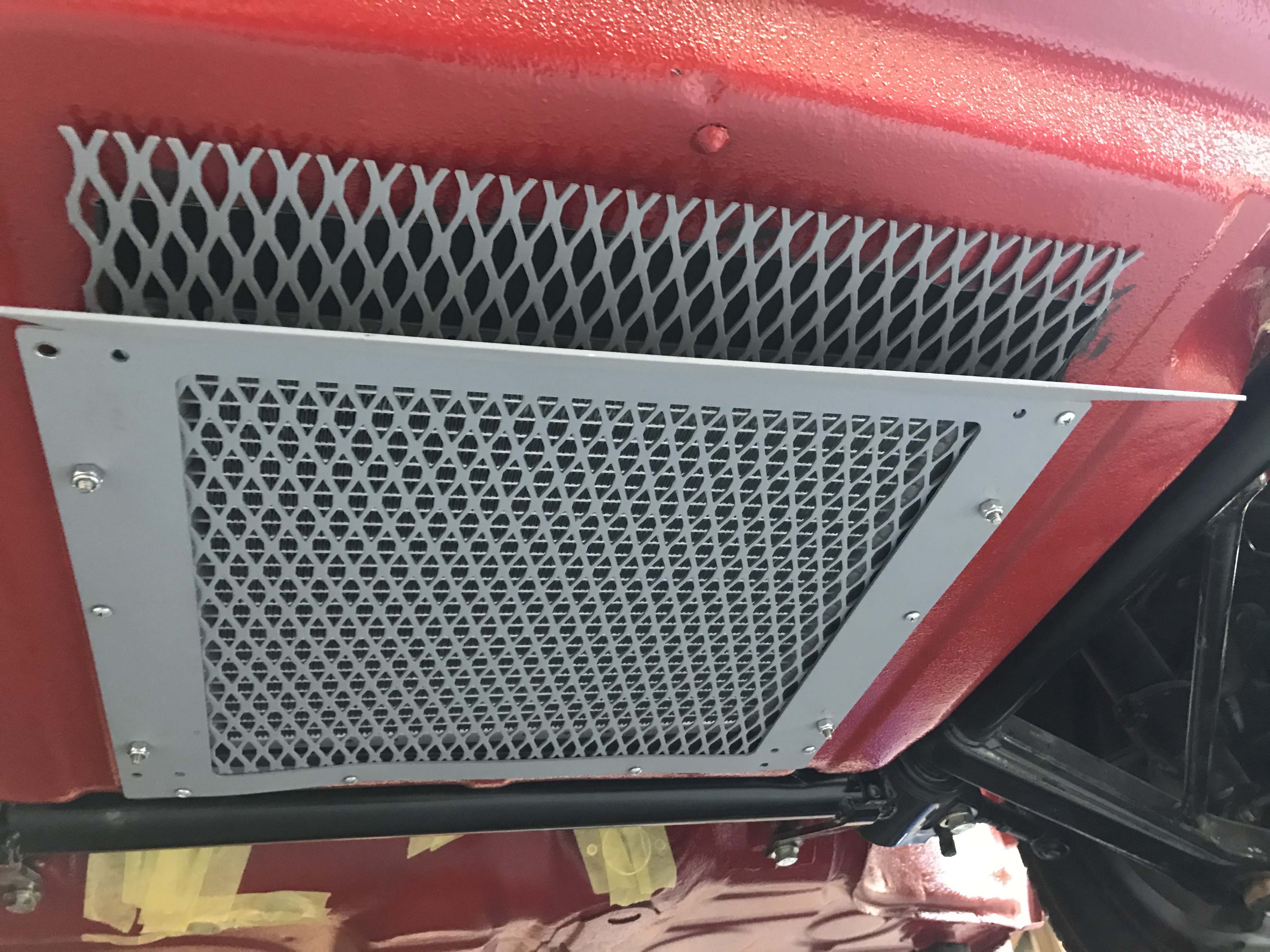 Well, I started the installation process of my A/C on my '74 the other weekend. I went with the Classic Auto Air system. My plan was to just cut the holes needed for the hoses and condenser box prior to painting the [top side of my] car. Here are some photos of the condenser install: