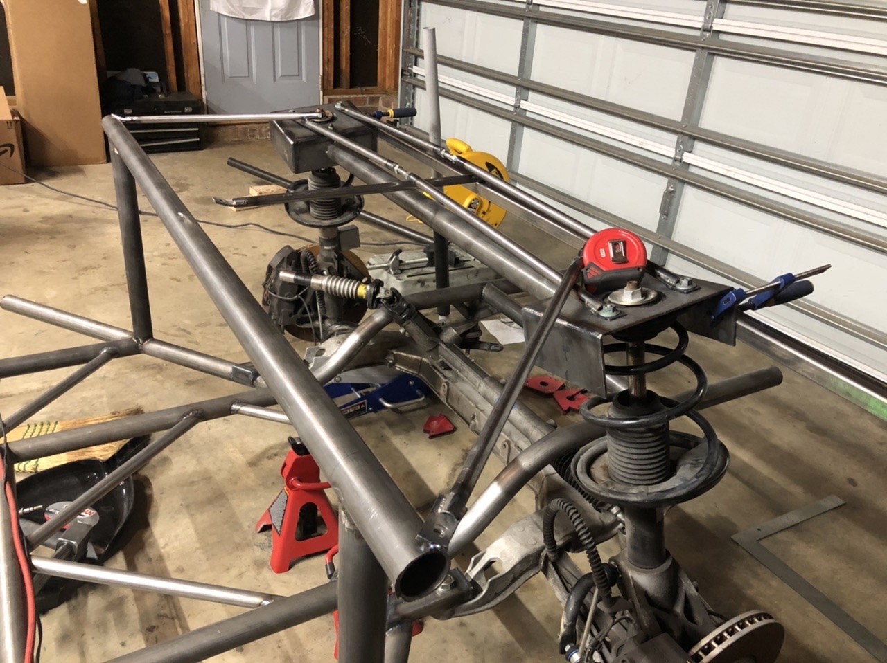 I cut the holes in the strut tops to allow for the strut to pass through. Next i welded in what ill call: The bar that links my struts together and is critical to my camber. I used quite a bit of scaffolding to make sure it was setup right. I used actual measurements from a boxster to space the struts correctly. One of the complaints of the boxster is you cant get enough camber from it stock. I added 1/4” of strut top negative camber. Its not much but i should be able to get a little more out of it if need be. The control arm angle was a point of contention for me. I couldnt find a boxsters control arm angle at full droop, so i... i eye balled it.. intelligently. i know it should be around 1 degree up at ride height, which from what ive read stock ride height is where the strength of this suspension lies. I settled on 20 degrees at full droop. I figure the car will settle an inch when it sets on the ground which will bring it somewhere close to where it should be. This car will have adjustable suspension so i can tune in the control arm angle as needed. It also sets the strut tops fairly low, which is a plus in my book. Once i finished the; The bar that links my struts together and is critical to my camber bar I then moved onto caster. I matched the caster i measured on a boxster and matched it with two temporary bars. now onto bigger and better things! |