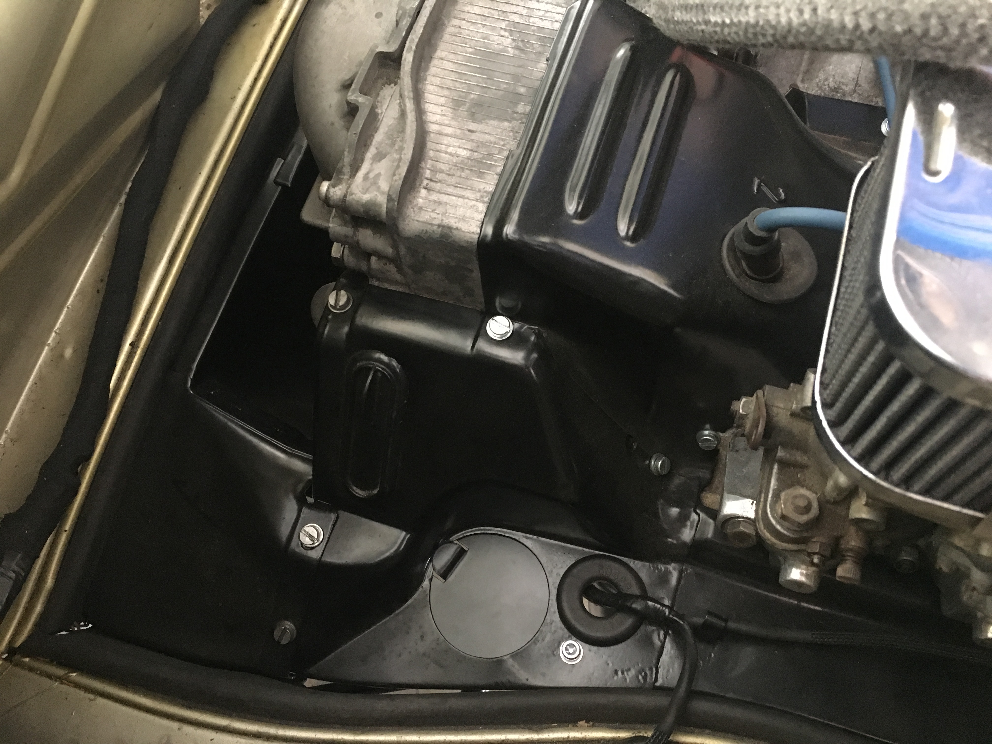 For us that have headers and no heat, what to do with the big round holes through the engine tin? Bruce solves it. Nice cut, painted, exact fit with hardware. (IMG:style_emoticons/default/beer3.gif) Way to go Bruce!! |
