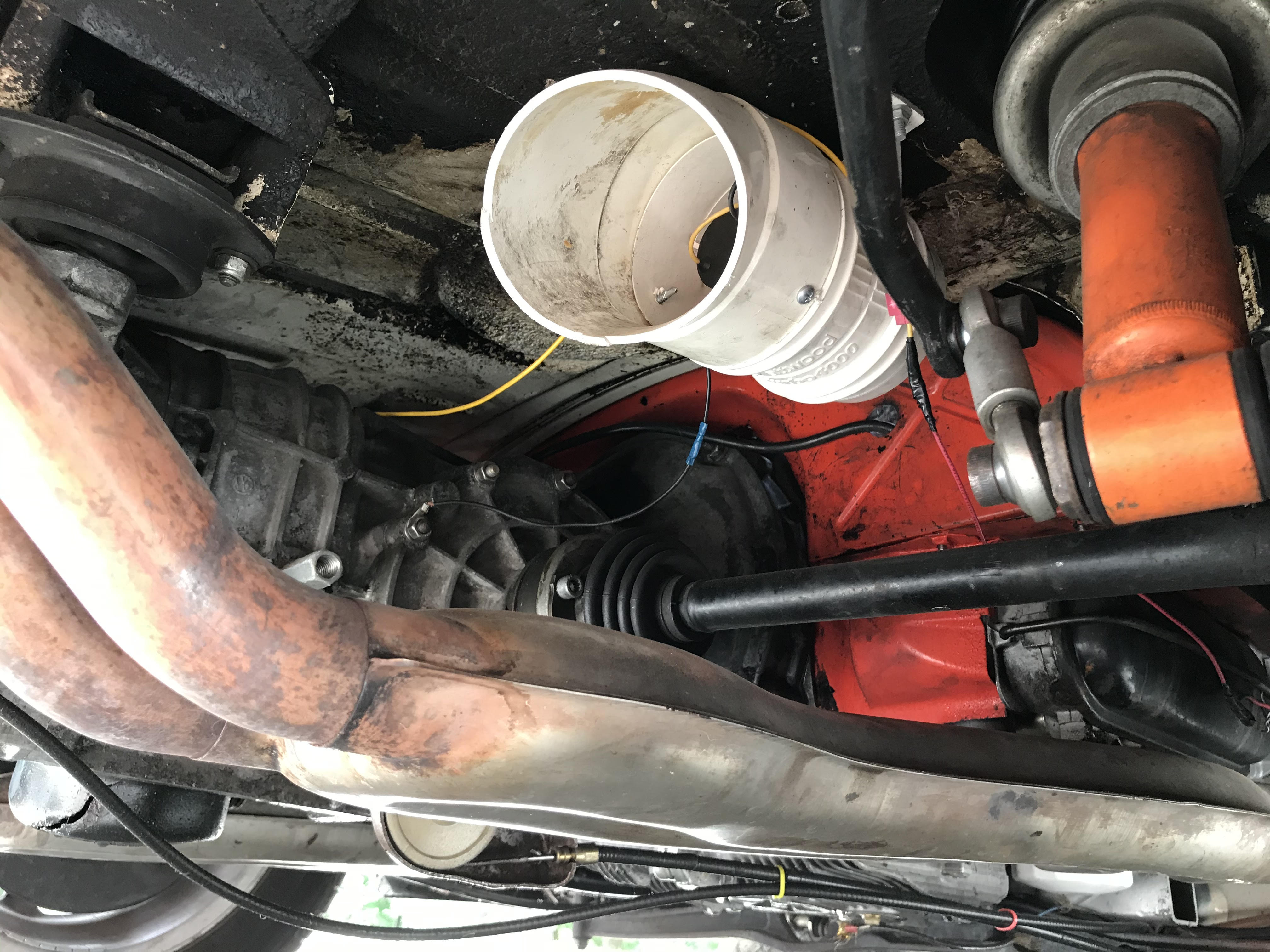 Cooling test under car with and w/out fans, Installed (2) 4" fans under trunk each side of transmission. Oil cooler was not installed for test, oil temp was 220 out side temp 90. Rough numbers fans removed 11 deg under car and no affect on oil temp.