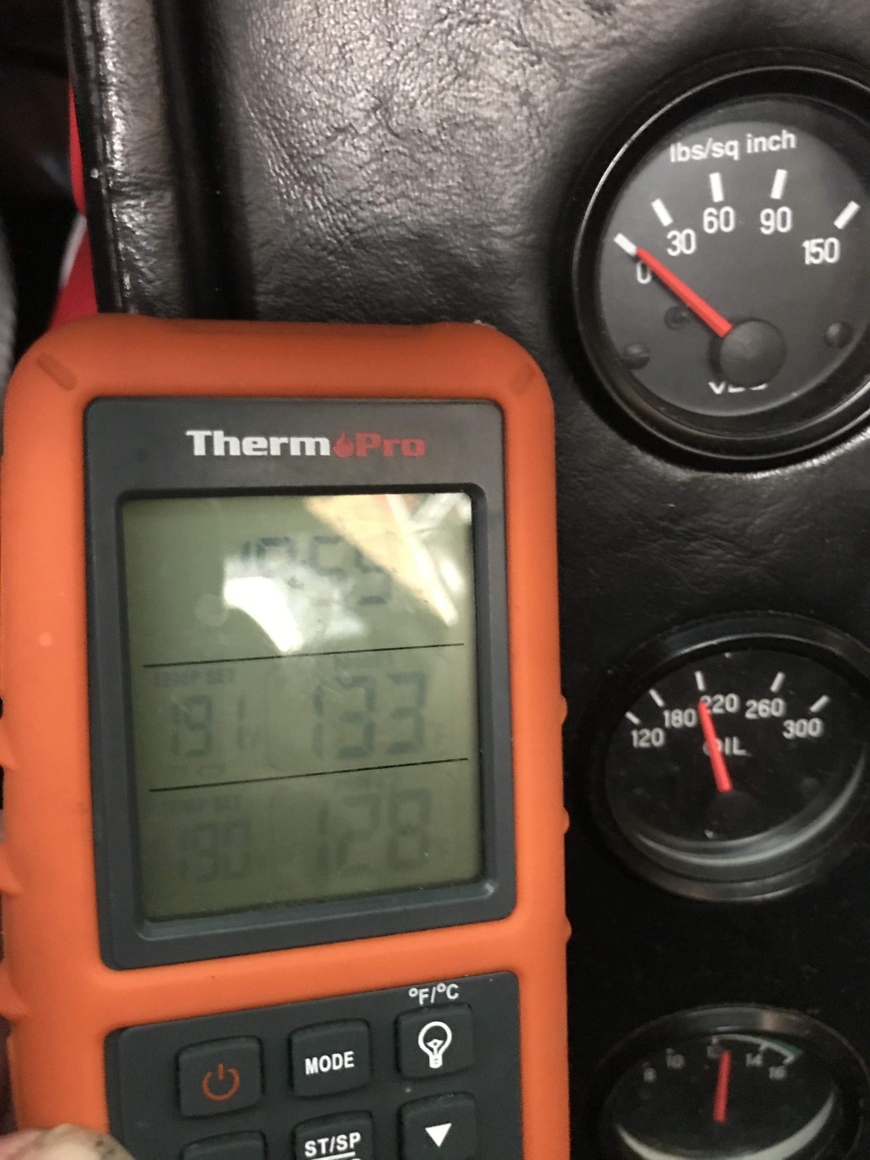 Don't look at oil pressure numbers turned off car to take pictures. Next test will be with oil cooler installed?? Is 220 oil temp acceptable? 2056 engine with duel 40 carbs |