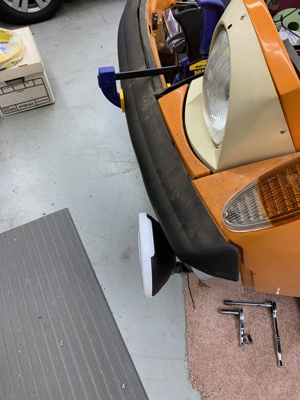 I’ve always been fascinated by the front lower spotlight mounting that appears on some of the GT cars, notably the winning 1970 Marathon de la Route cars. A few years ago I got a chance to obtain some original Cibie Iode 45 lamps from a seller in France. These had yellow lenses – one fog, one driving - which matched the yellow Cibie Tango’s I have mounted in my GT tribute car already, in the “standard” fog light position within the fiberglass front bumper. Not clear to me was how the factory fabricated brackets were designed. The inverted “T” cut into the fiberglass bumper meant that the brackets must somehow get fed through that to get mounted; also somehow they mount to the body and may / may not hold the bumper on? Searching in-period as well as recent pictures did not yield many clues; a few detailed the outside construction and bracing, but I had no clear idea of what was behind the bumper cut out. Until: luckily last summer I did get a chance to see the original “Number 2” Marathon car up close at Luft 6, so took the opportunity to crawl around under the front of the car to try and see what was going on. That is, until folks who were waiting to take unobstructed pictures of the legendary vehicle were bored of waiting for the strange geezer lying on his back peering into the oil cooler opening….! ![]() I took some detailed pics and thought that attempting to make up some brackets might be a good winter project. It is not clear to me (on olde number 2) whether the brackets were the originals or replicas – but I learned enough to want to try and replicate them. So the brackets themselves (as the pics show) look pretty basic on the face of it. But some thought obviously went into the design, as they need to meet multiple criteria: - be shaped such that they can be fed through the inverted “T” cut in the bumper - secure the bumper to the body - have welded in bracing to prevent the lights vibrating & flexing - clear the front valance mounting tabs (which are just below the bumper mount holes) The upper piece in this shot shows the side profile I went for, bent up in aluminum as a test for clearance; one of the main bracket is being fab'ed using mild steel. The cut in the bumper (fiberglass) was done with fingers crossed but turned out to be correct, the shot below shows a test fit & alignment check before cutting the vertical: I welded some M6 nuts to the strips to use as mounts, aligned with the holes in the bumper and the body. Cutting the bracing pieces needed some experimentation and mocking up, as looking carefully at the existing photos of the OUTSIDE, it was hard to judge overall dimensions – extension, drop, etc. – so in the end it was basically a visual judgement call. and.... |