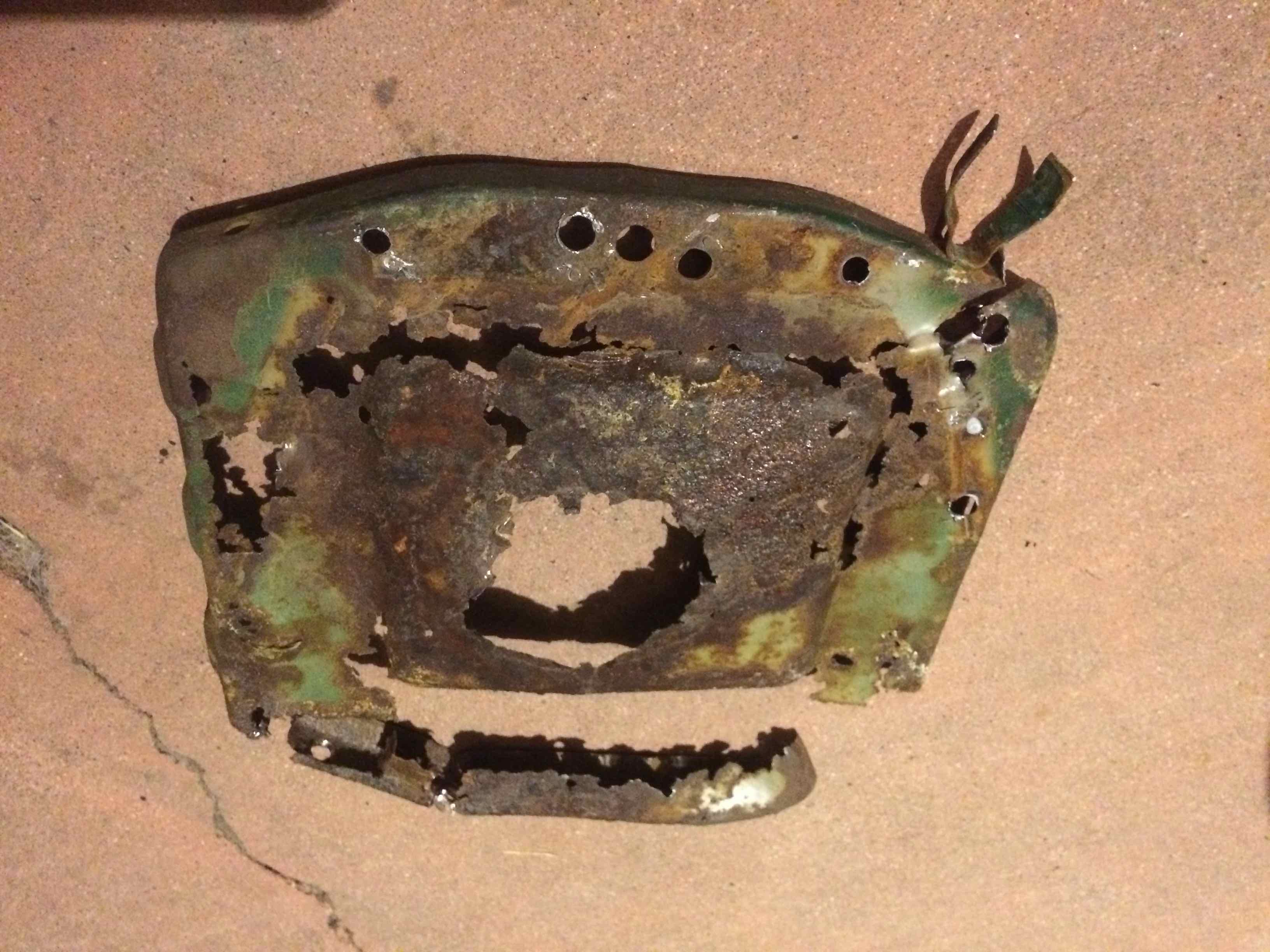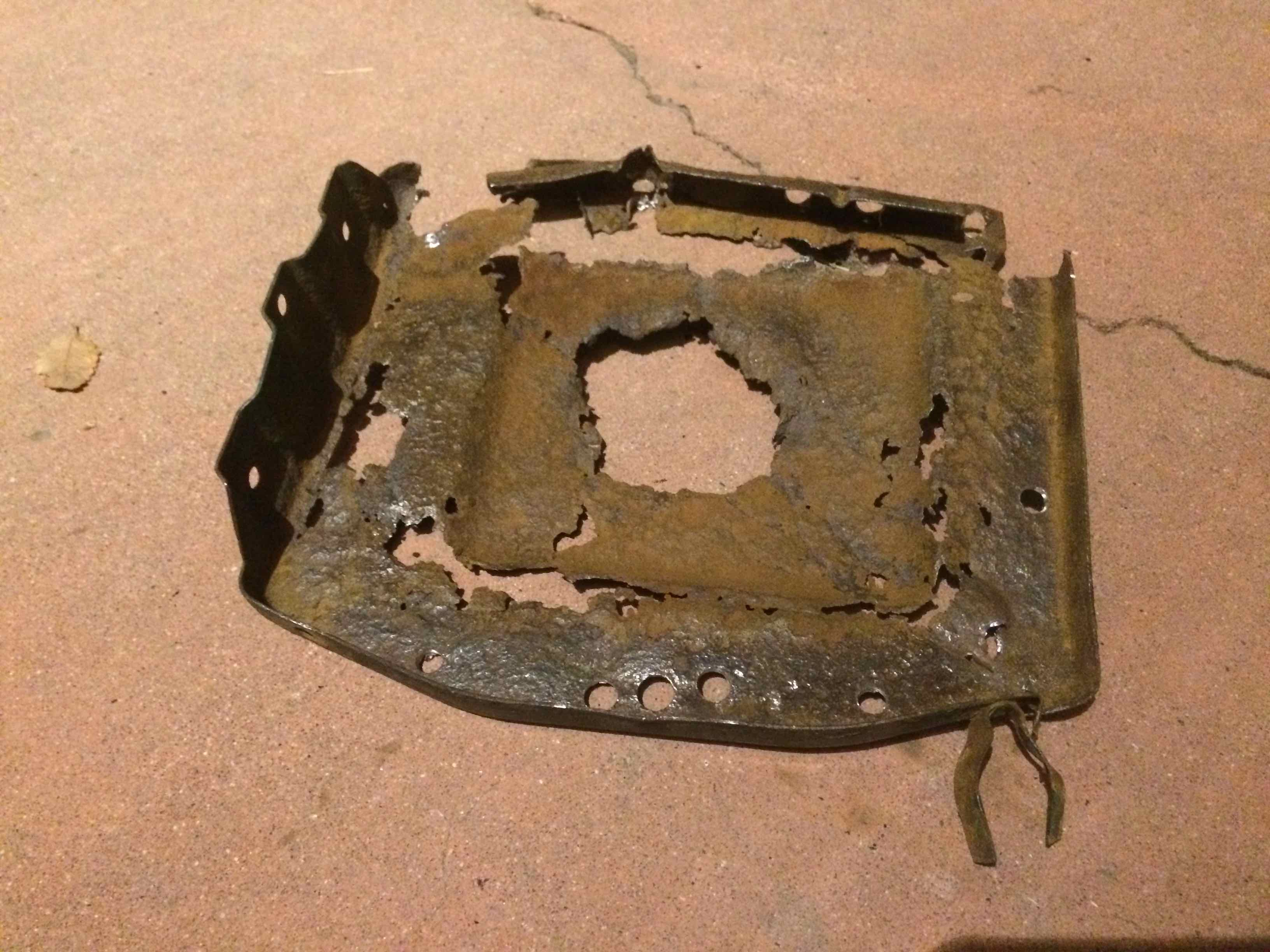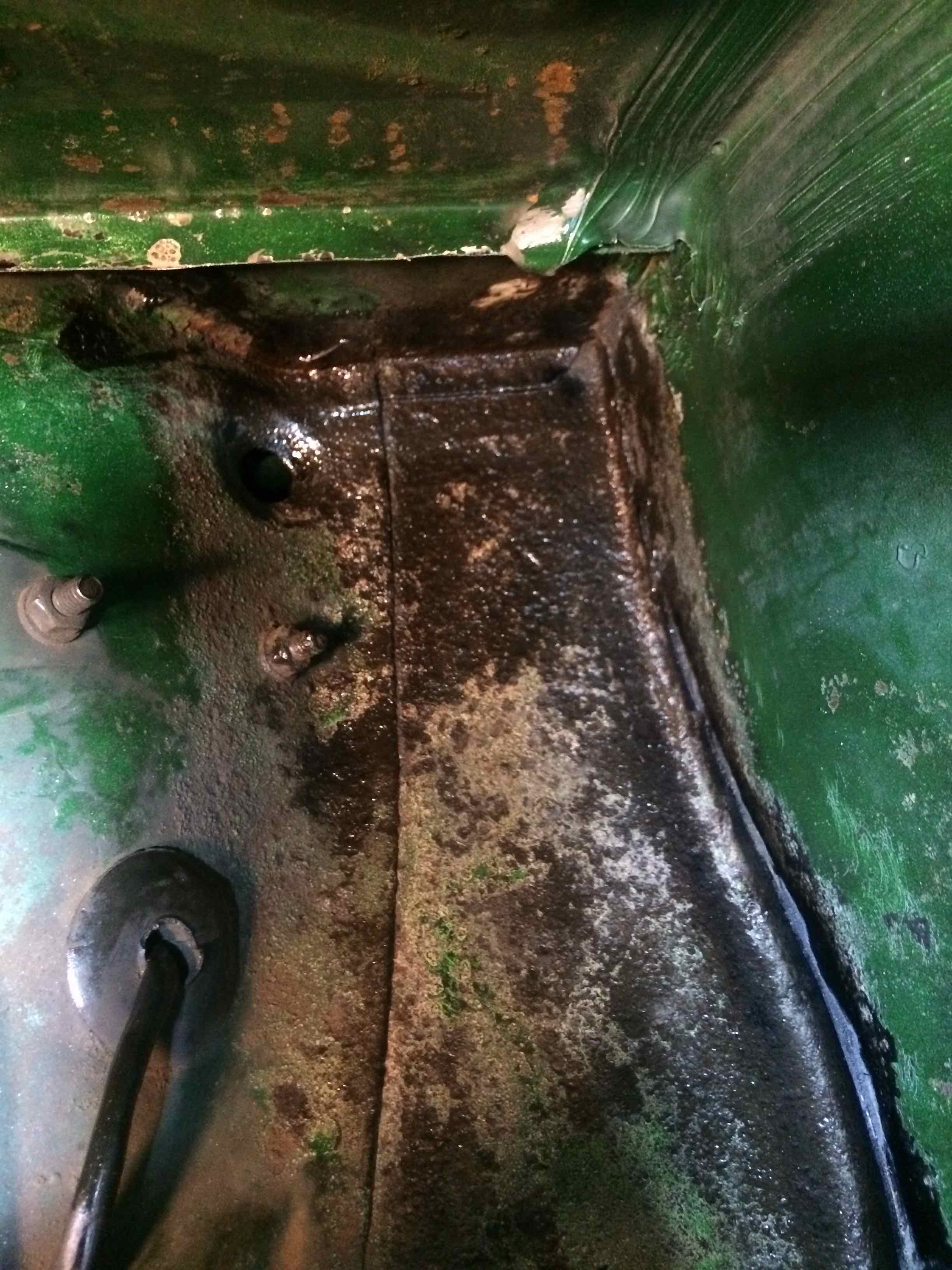 probably shoulda called in experienced help on this but, the rusty battery tray's out. i was contemplating even sharing this (not my best work) but, figure it might be a lesson to someone else. i had a helluva time figuring out (i mean missing) where the spot welds were. easy enough to see the little dimples on clean sheet metal but, i was kinda drillin' blind here. after going at it with a wire brush on my cordless drill, i used a permetex product that sprays on in 2-3 light coats as clear, turning black where it finds rust (pics taken several hours later). as you can see, i decided on a hybrid bolt in, given the condition of the support and my bumbling attempts on removal of just the tray... i guess i'll use the holes i've already made to mark the new tray and carefully drill. debating if i want to use the threaded inserts that came with my new toy or just regular bolts as there's decent access. (IMG:style_emoticons/default/wacko.gif) |