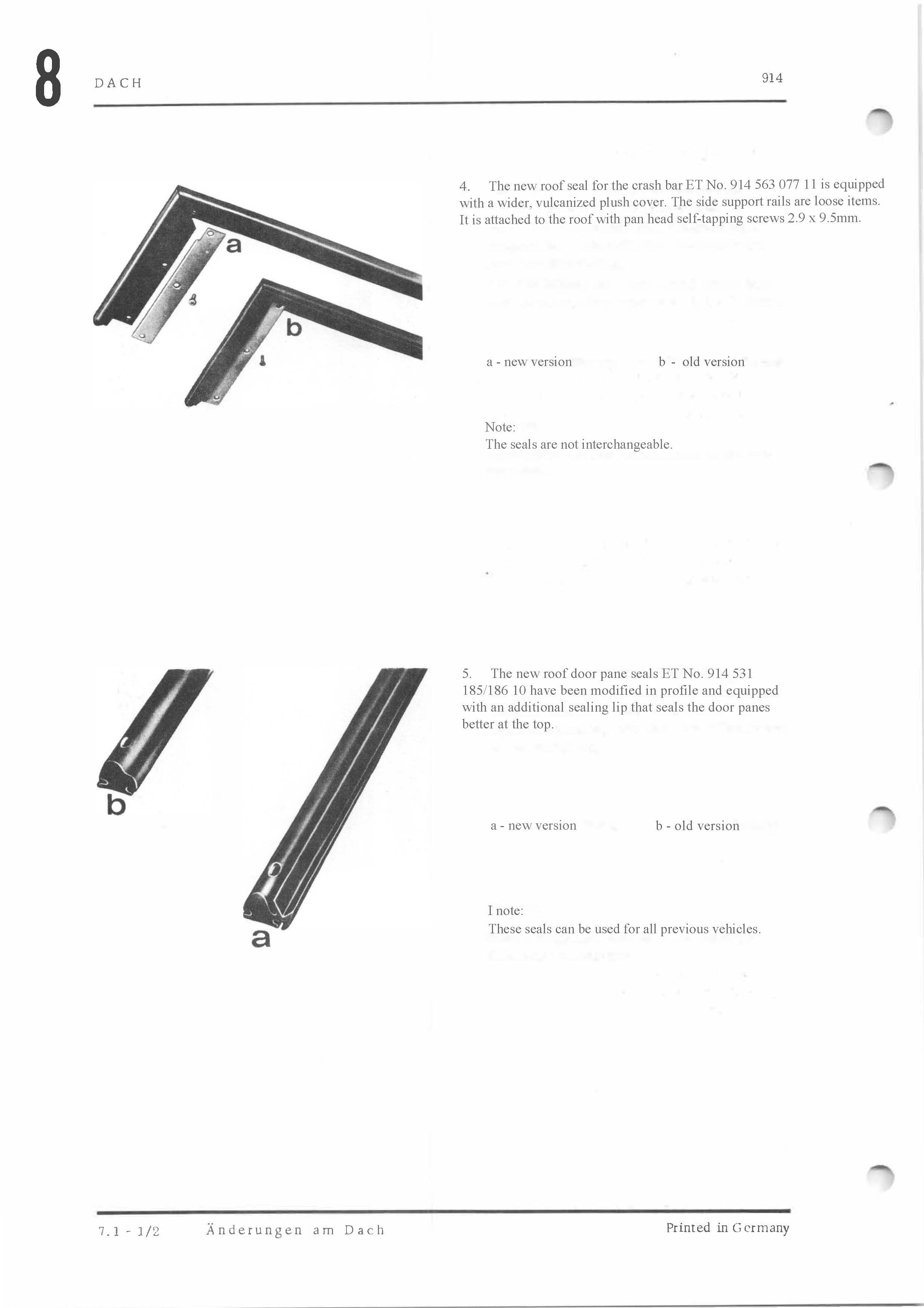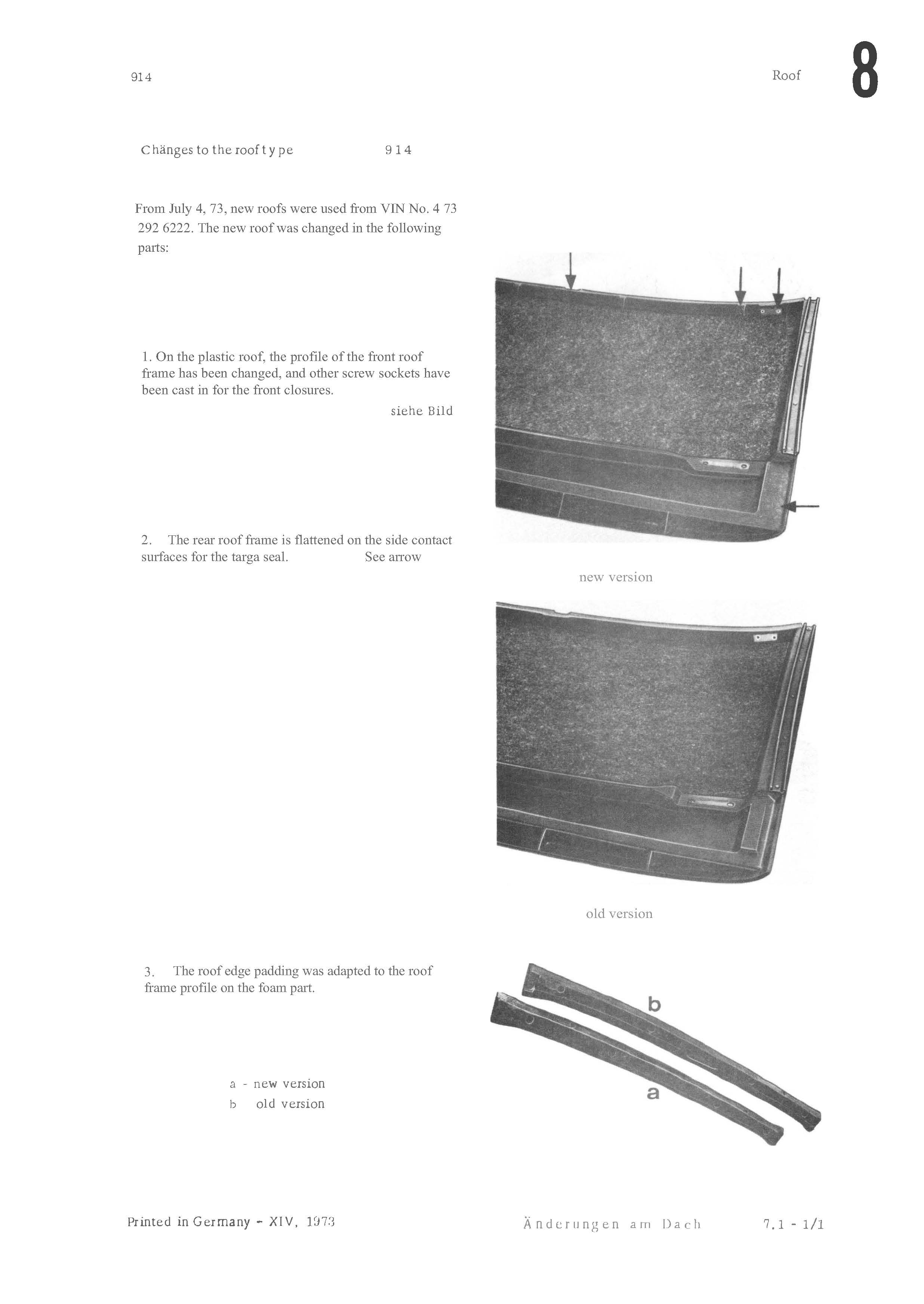 I'm curious myself as I've never researched it. And I need to figure out someday which of a couple of tops I have around here are early or late. So this was timely. (IMG:style_emoticons/default/popcorn[1].gif) Early top has a thin rib, late top has a thick one. So what is the time line that delineates between early and late? (IMG:style_emoticons/default/confused24.gif) Good evening, I am quite new to the forum but have already enjoyed a lot of different topics and find them quite helpful and motivating. Hope to contribute to this one. Looking at my Porsche 914 workshop manual I found the following information about the change of the roof: From July 4, 73, new roofs were used from VIN No. 4 73 292 6222. Further on Porsche introduced a new seal for the rear part that is not interchangeabel. I have tried to translate both sides that are covering the roof changes and attached them. Holger |