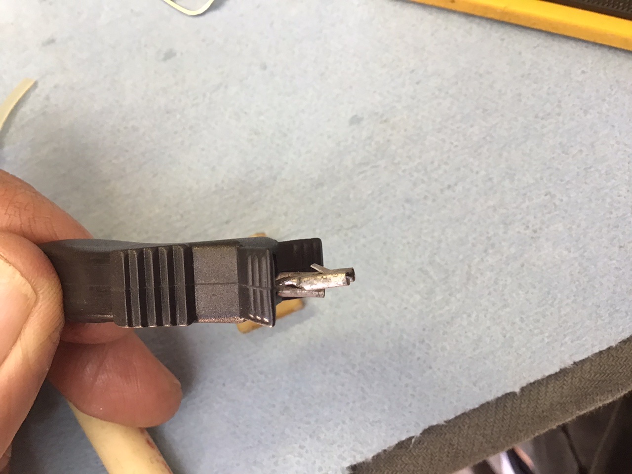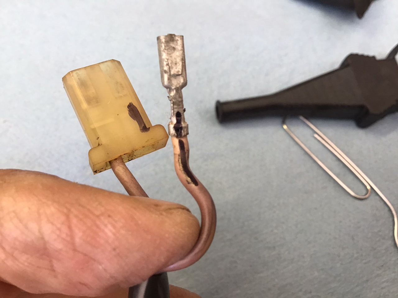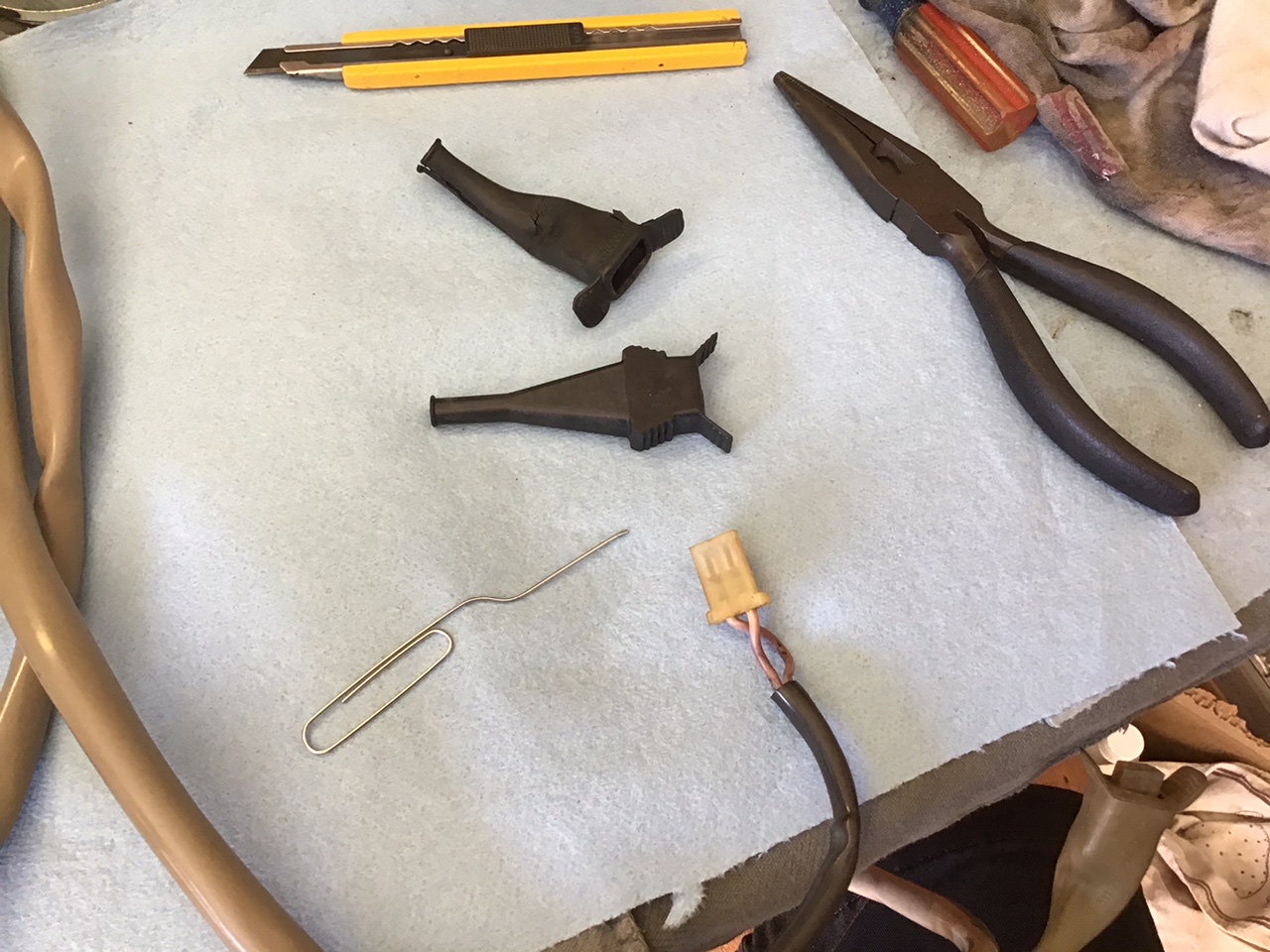 Notice the handy dandy release tool I made with a large paper clip, just a few taps with a hammer on the edge to flatten out. Im not sure if the wire orientation matters, but I marked one of the wires after taking it out so it would return to the same side. Getting the boots on were a bit of a pain, I used a bit of WD 40 to lube the boot. After you get the wires through make sure and push the tab back up on the connector or it will not lock into place. The plastic piece that fits into the injector is notched on two of the corners as if to fit into the injector in a specific manner but the injector has no such matching cut outs. Does anybody know if it matters which way these go in? Attached thumbnail(s) |
