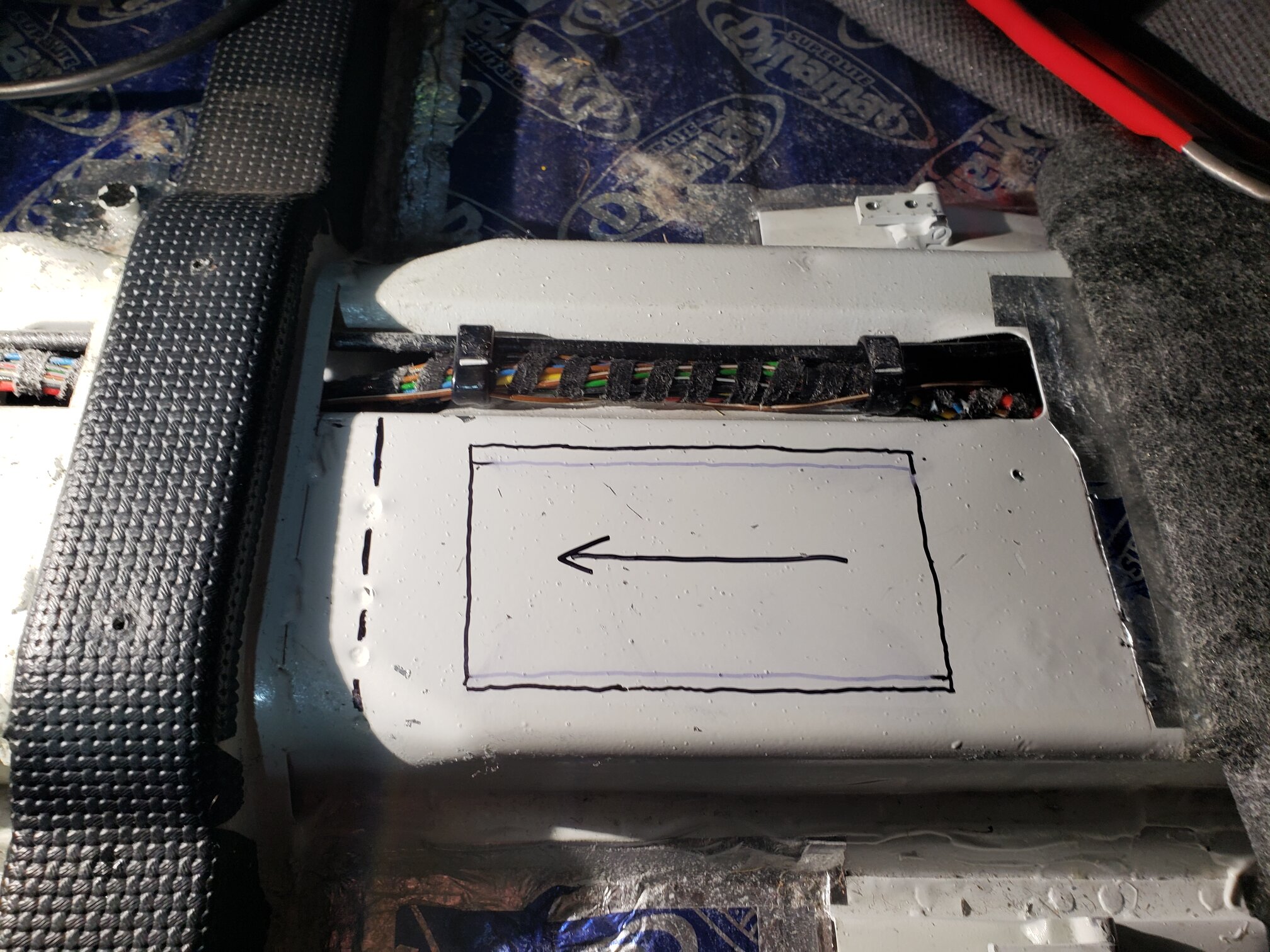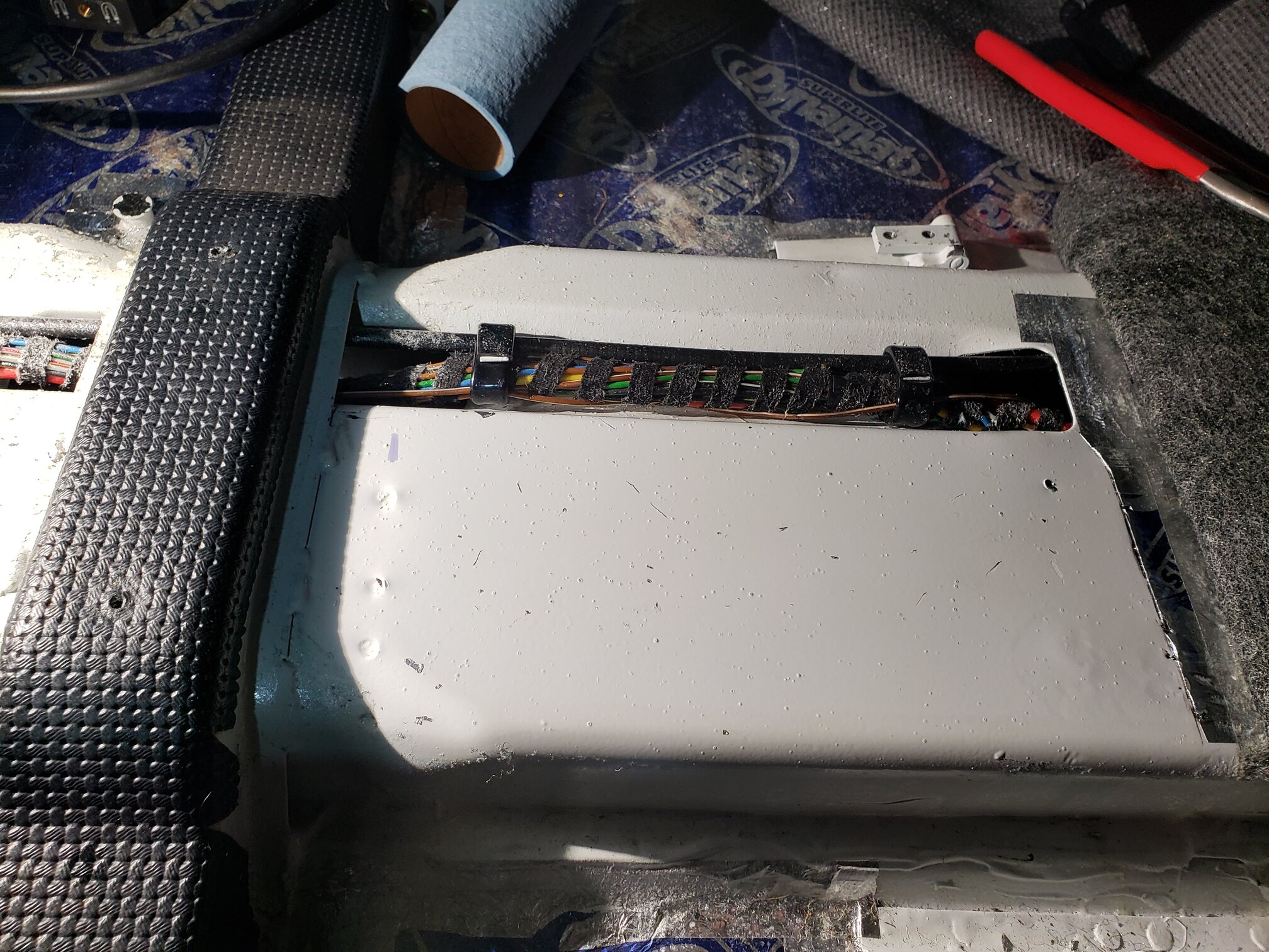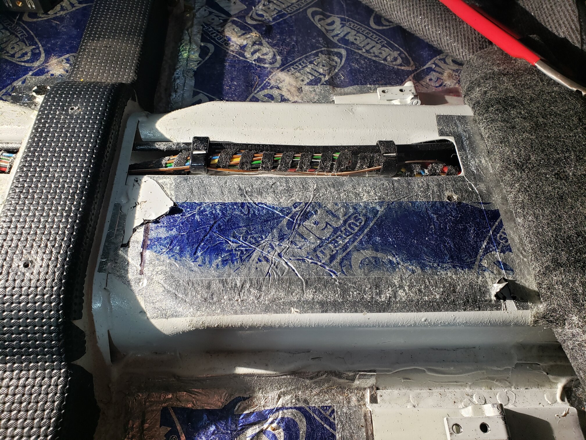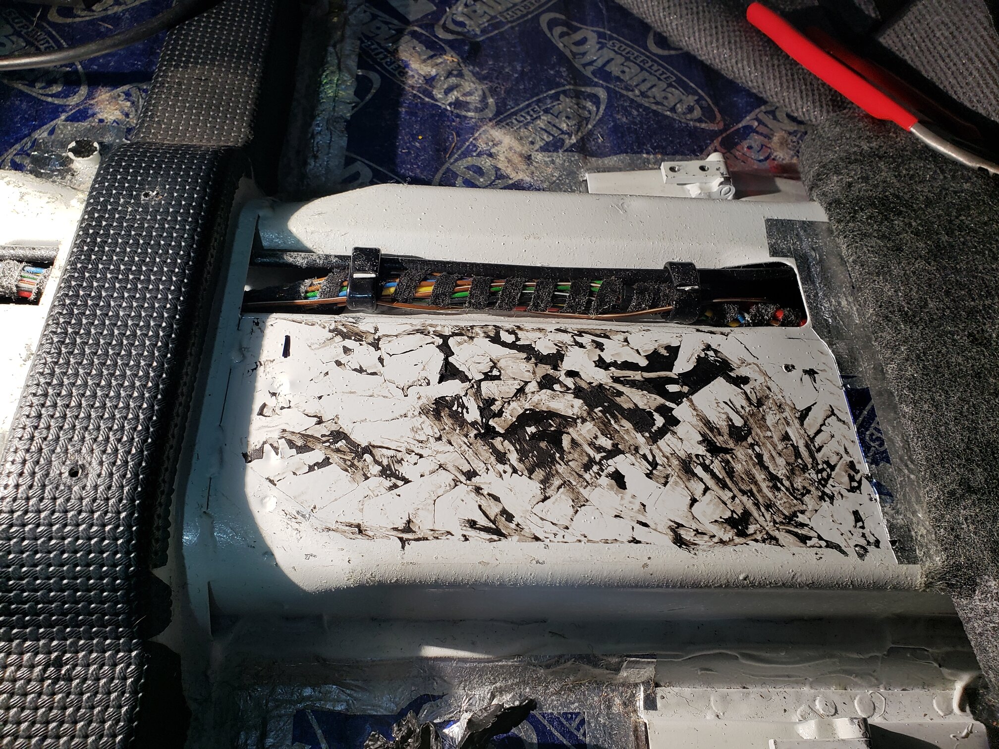 Carpeting pealed back revealing the sound deadening I used.