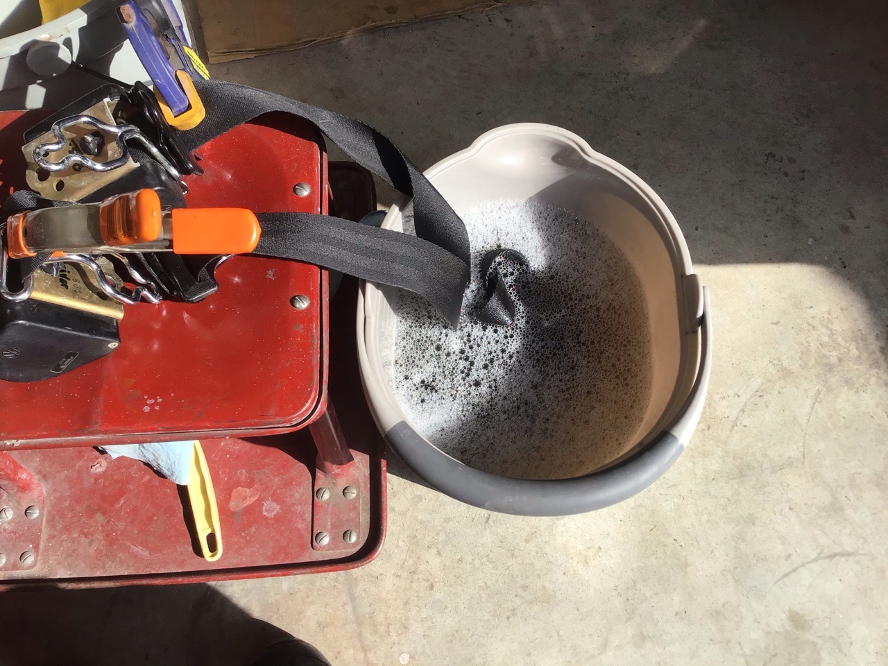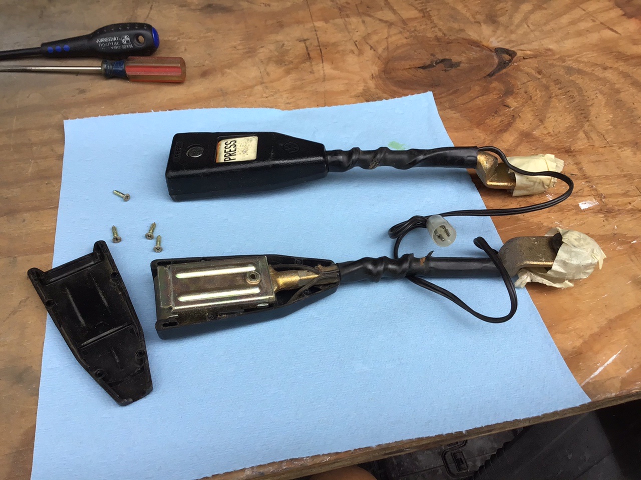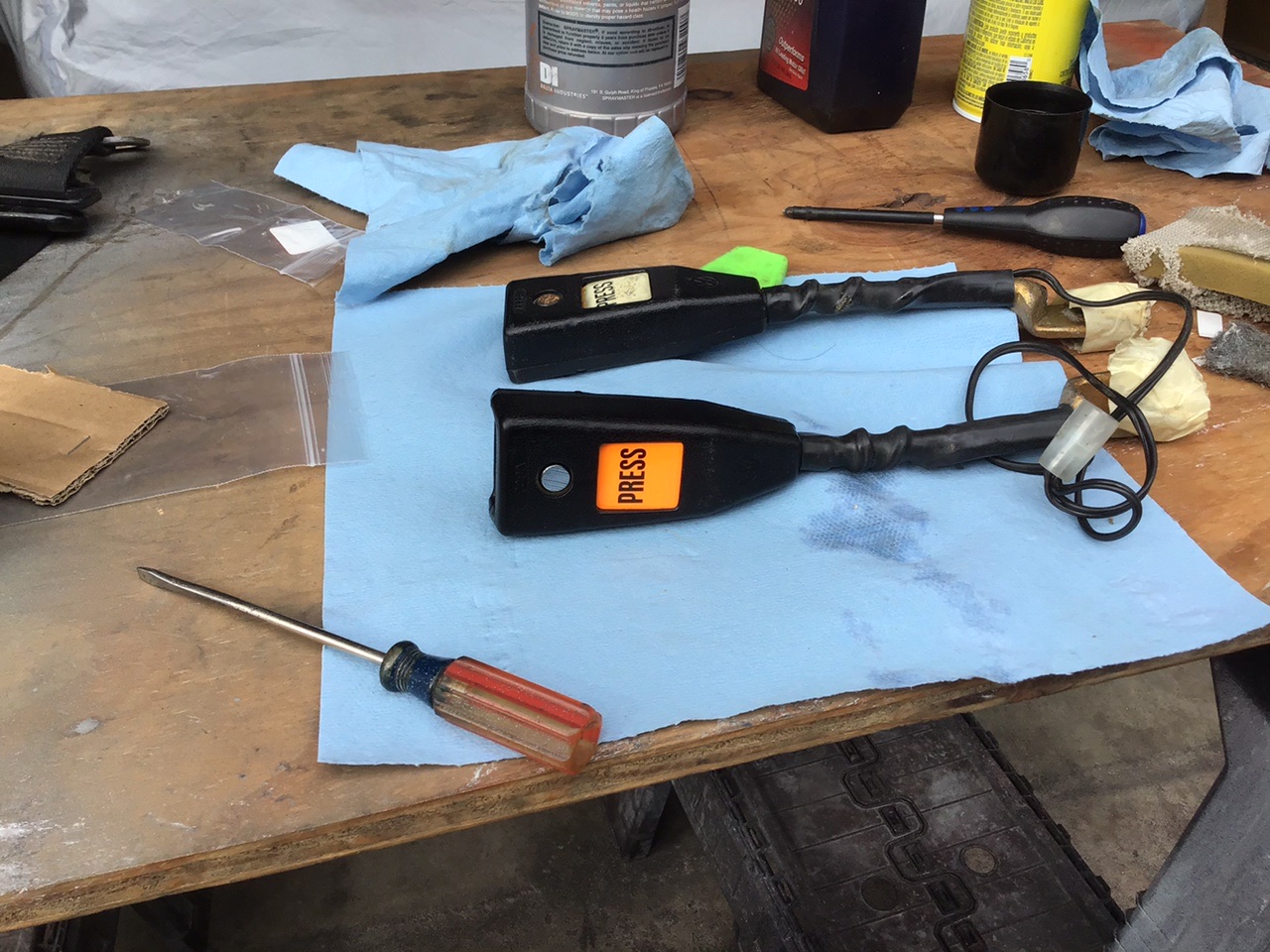 Time to clean and inspect the seat belt bits and pieces. Off with the old PRESS sticker And on with the new sticker And now for the retractors The belts seemed pretty dirty, so I decided to give them an overnight bath After soaking and manually agitating the water was black, so I dumped it out and soaked again in water only. The water was only slightly dirty, so I called it good. After this, I hung them up over night to dry. They seem to be working much better now. (IMG:style_emoticons/default/aktion035.gif) Nice touch with the new stickers. Where did you get them? And I assume you have to take them apart to remove/replace them? |