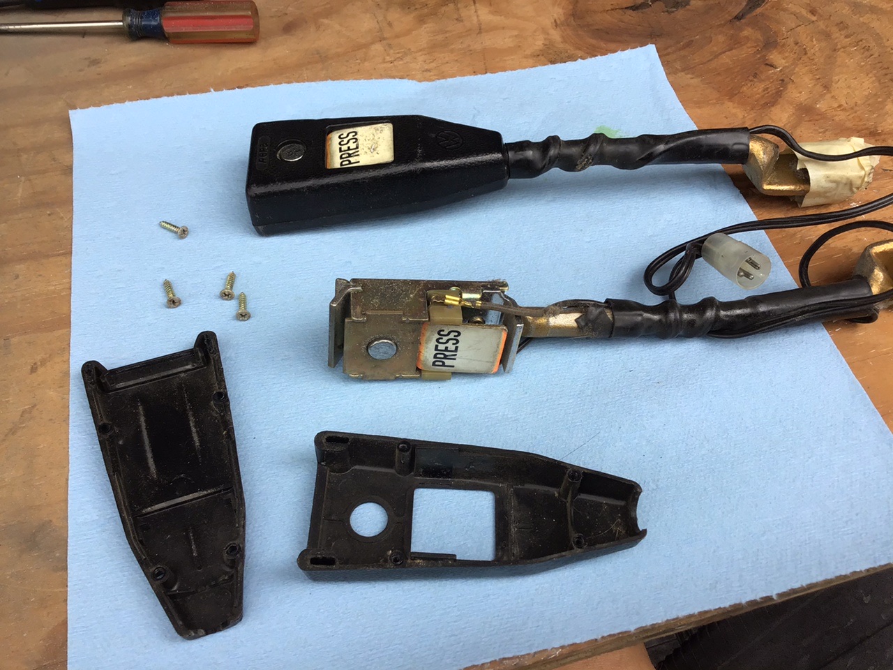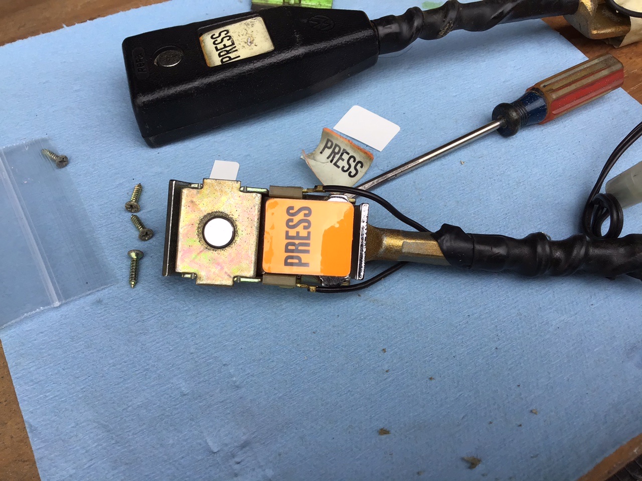 Off with the old PRESS sticker And on with the new sticker And now for the retractors The belts seemed pretty dirty, so I decided to give them an overnight bath After soaking and manually agitating the water was black, so I dumped it out and soaked again in water only. The water was only slightly dirty, so I called it good. After this, I hung them up over night to dry. They seem to be working much better now. (IMG:style_emoticons/default/aktion035.gif) |