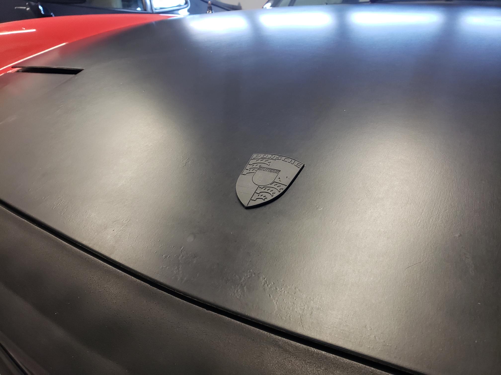 Then my brother Zach gave me an extra Porsche badge that he had blacked out for his dark grey 911. He didn't like it, but I though maybe it'd look cool on the matte black hood. I don't intend to run one when the car gets painted, but for now I like it. I cut off the pins on the back and stuck it on with 3M tape. |