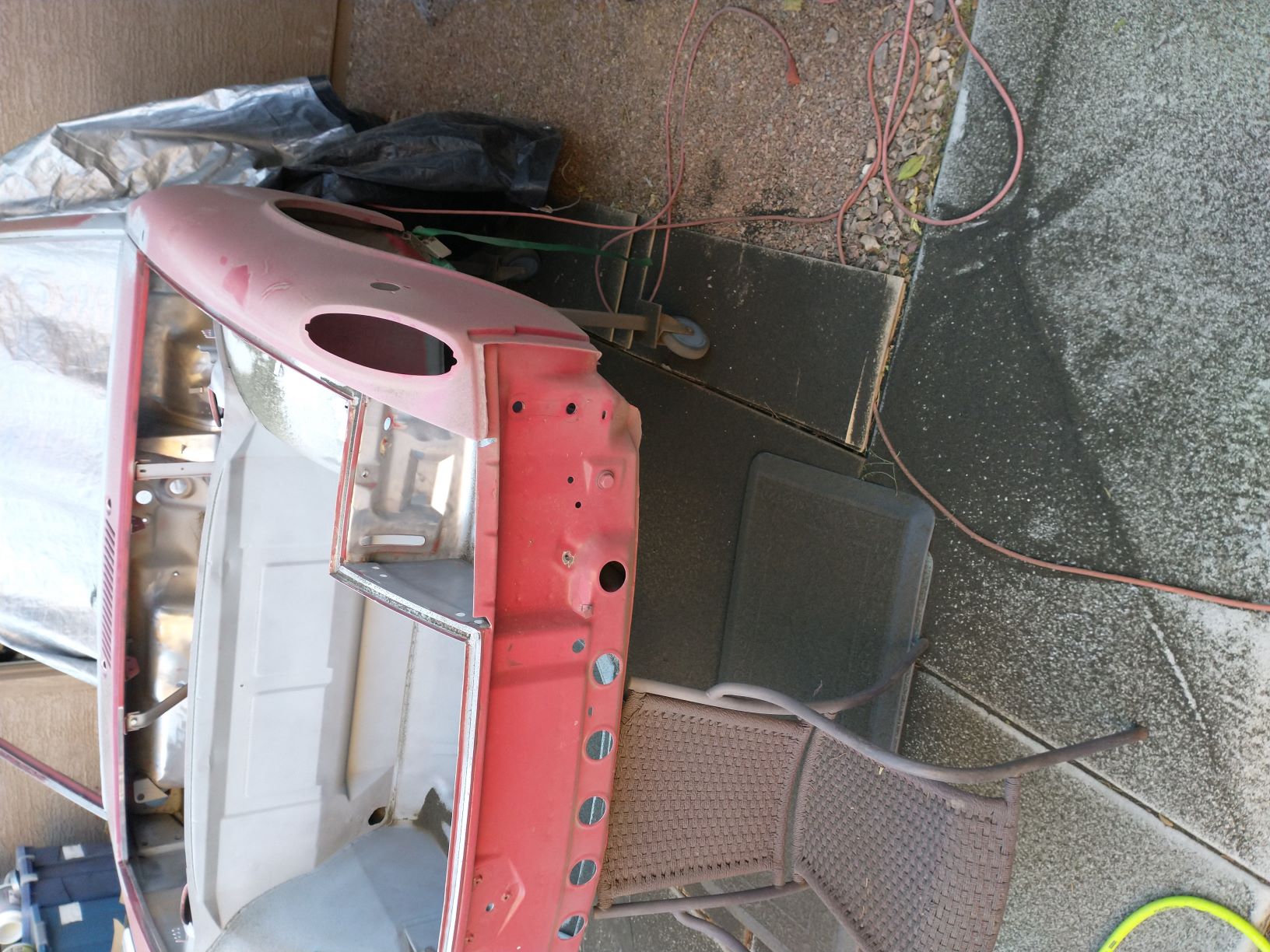 I new around here, but have been lurking for a bit trying to soak up all the 914 knowledge and information I could! I was looking into building a Factory Five 818 kit with the Subaru flat-4, but the cost of entry was a bit too high, and the time & space needed to build a car from scratch seemed overwhelming. But it got me thinking; that's basically a tube-framed 914 with an odd body. I wonder if anyone has put a Subaru flat-4 in a 914? A few Google searches later I learned that a lot of people had, and parts were out there to spend my money on! Long story short, I found two rollers with no engines or transmissions in Tucson, AZ a couple of hours South of me. Soon I rented a car hauler for a couple of days and my "Craft Project" (my wife's label) was begun. The rollers were a green 1971, and a red 1974. I wanted to restore the 71 because it just seemed to have more character. The 74 had been partially stripped for an electric conversion project, and seemed less "car like". Sadly, the 71 needed a bit more work than I was setup to handle. So, it had to be the 74 who I have simply labeled as "Red". I will try to track my build process here as best I can. I tend to get working on things and forget to document things, but will try to keep track. Here's Red when we got her home on the trailer and tucked away in the back yard for the moment. Mike Attached image(s)
