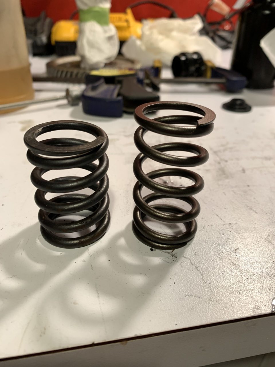 To coax you back in, pictures! The first thing my aging brain did was ask: "what the hell lifters are these?" (IMG:http://www.914world.com/bbs2/uploads_offsite/www.patsachs.com-7353-1617896825.1.jpeg) (IMG:http://www.914world.com/bbs2/uploads_offsite/www.patsachs.com-7353-1617896826.2.jpeg) So I called webcam to see if they could help me identify them, and sure enough they are not theirs. So I ordered a set of Webcam solid lifters as I have seen/heard of plenty of horror stories about cams eating themselves when the improper lifter cam combo and oil is used. And for posterities sake: Scat 20011 Springs next to a stock spring (IMG:http://www.914world.com/bbs2/uploads_offsite/www.patsachs.com-7353-1617896826.3.jpeg) I measure out the Scat springs to be around 2.32" total length and an ID of around 0.931" (IMG:http://www.914world.com/bbs2/uploads_offsite/www.patsachs.com-7353-1617896827.4.jpeg) The guide boss is around 0.924" so the fit is certainly snug: (IMG:http://www.914world.com/bbs2/uploads_offsite/www.patsachs.com-7353-1617896827.5.jpeg) But they fit. At first my installed height was around 1.45", but a few "seating taps" with my hammer got it to around 1.48" so I am getting to a more acceptable level. Next I noticed that my stock keepers were nice and shiny at the mating surface, where as my brand new ones looked like someone finished the edge with a chisel *sigh*. So over to the only reason I agreed to redo my kitchen countertops: an ultra flat sanding surface!! (IMG:http://www.914world.com/bbs2/uploads_offsite/www.patsachs.com-7353-1617896828.6.jpeg) And a few strokes later: (IMG:http://www.914world.com/bbs2/uploads_offsite/www.patsachs.com-7353-1617896828.7.jpeg) Nice and shiny and smooth (stock keeper is on the right, new one on the left) With this done the keepers no longer "rocked" when placed on the stem of the valves and when I installed them, I am now at 1.5" of installed height! Yay! This should give me a seat pressure of around 140 PSI (IMG:http://www.914world.com/bbs2/uploads_offsite/www.patsachs.com-7353-1617896829.8.jpeg) And my clearance from coil bind should be around 0.1" with a hypothetical nose pressure of around 220 PSI. I am still on the fence about if this is enough for the webcam 86B. In conversation with webcam, they said it is in the middle between their double and single springs. I have no intentions of running this thing above 6000 RPM, so that is where I am at. Should I run what I brought? Should I go double spring? I could also go "beehive", but both would likely require machining. Beehive springs |