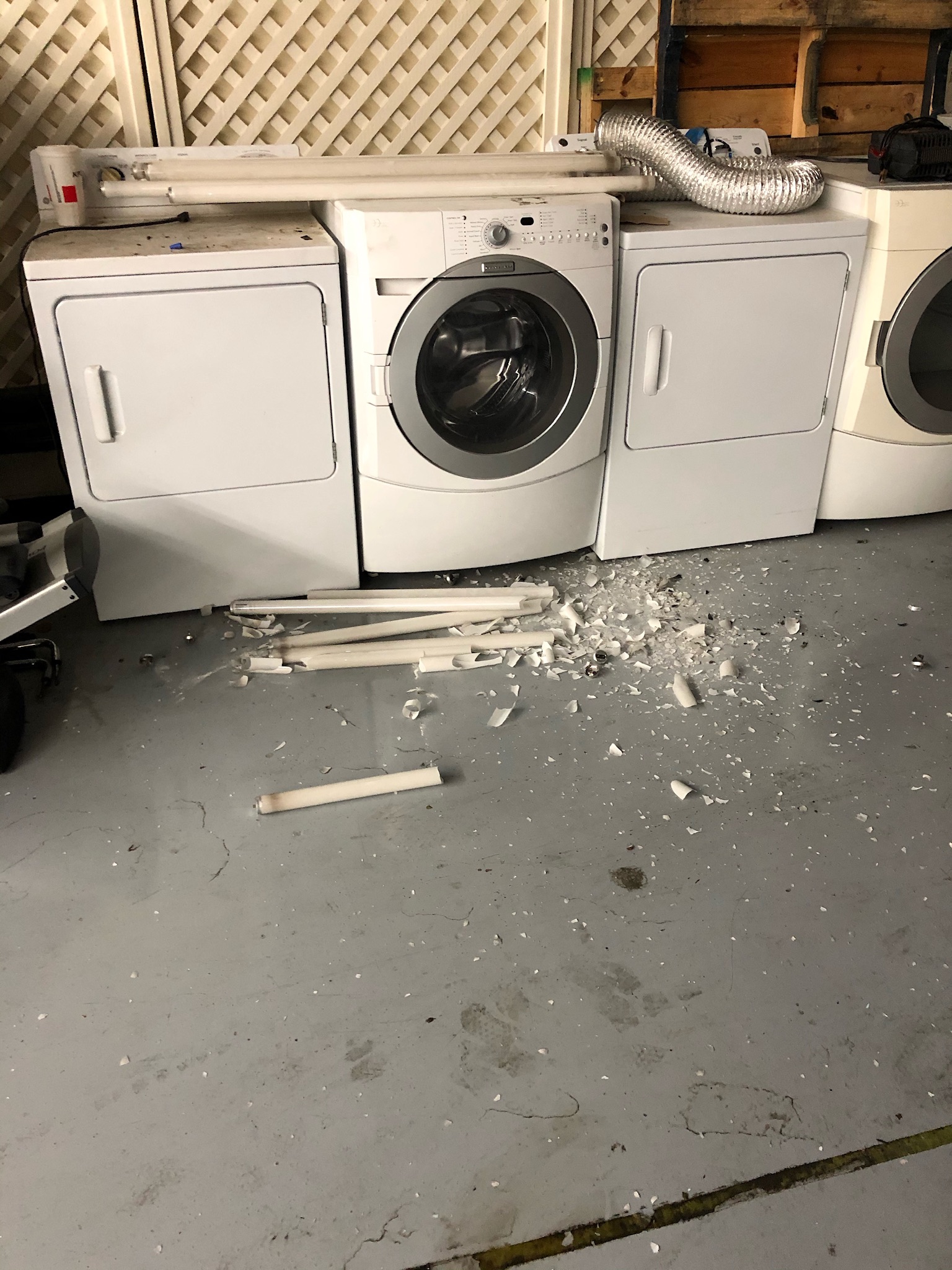 Was sitting in the car keeping the rpms up when I started hearing loud popping and what I assumed were engine bits being thrown to the floor... Turns out it was this... A crew is retrofitting the lights in the warehouse, these were stacked on the W/D near the rear of the car, the exhaust vibrated them off. (IMG:style_emoticons/default/lol-2.gif) |