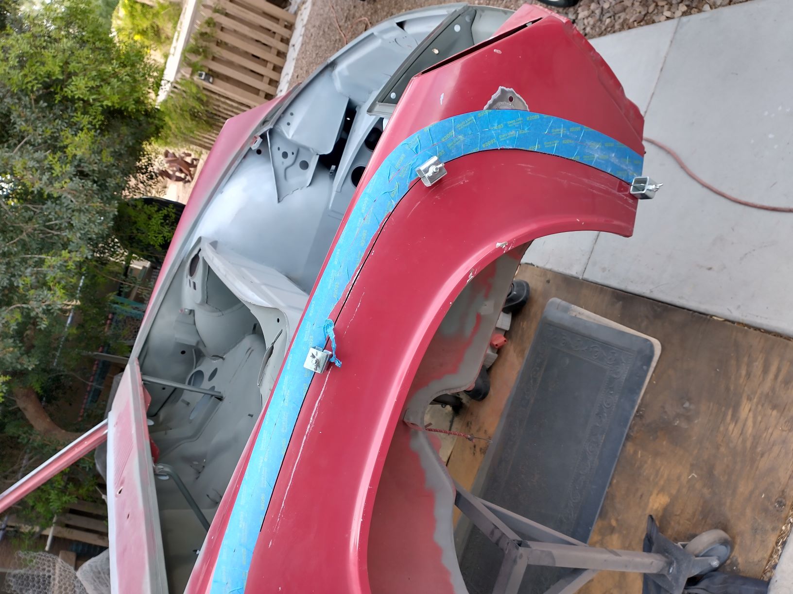 I finally was able to get my flares and rockers. A big shout out to Patrick Motorsports (who knew they were local!), and James Patrick for taking the time to go over his approach, and lessons learned on how to install the flares. I really appreciated his time and getting to see some really cool cars, and learning the local options for take-off parts, etc. I started with the rockers first. Got them trimmed, openings cut out, and holes drilled for mounting. I did my best to get each side of the car all lined up between front, rear, and rocker. It's challenging to try and test fit the flares without an extra sets of hands. How does that song go? "The first cut is the deepest"... I used my butt-weld clamps to mostly keep things in place until the cut was finished. Definitely had the "what have I done!" moment! It sure takes a bit of sanding to try and get the flares to fit tight to the body. I just have things temporarily mounted. Still need to sand things a bit more in a few spots, and I need to find the right bolts and order some more rivnuts. No clue why it keeps rotating the images until you click on them! (IMG:style_emoticons/default/screwy.gif) |
