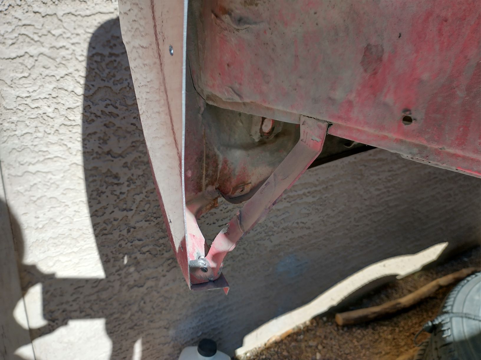 Working on reusing/repurposing the fender braces on the rear fenders since the area they attach to gets cut out. This one is pretty easy since its close to where it needs to be, and can just be bent a little to line up with what's left of the steel fender. It already has the holes in it from drilling out the spots welds.