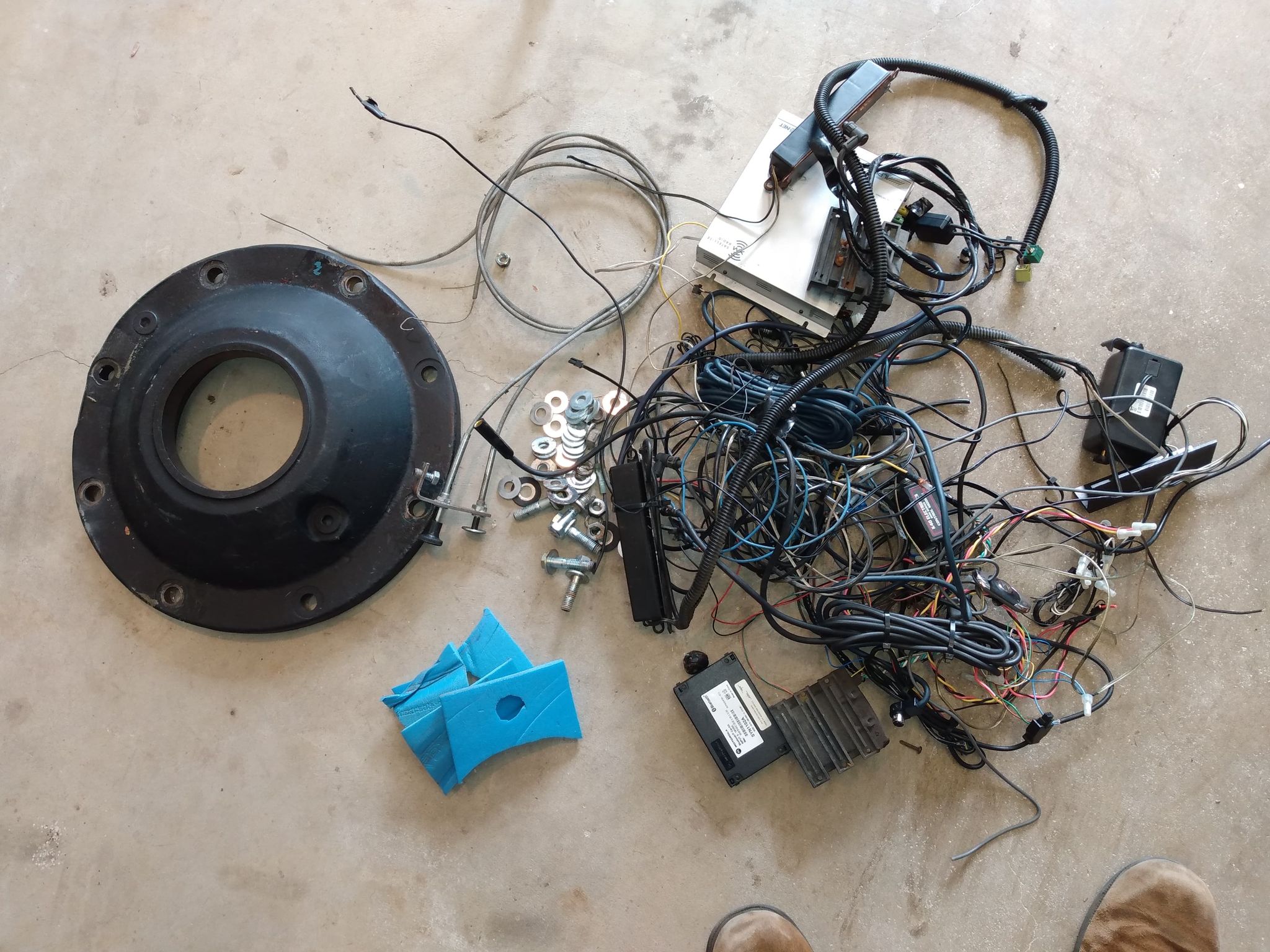 Spent some time today helping a fairly new owner sort out some issues. Removed front and rear hard wired radar detectors and a satellite radio system with Bluetooth leaving just the am/fm/cd head installed to fill the hole in the dash. (IMG:style_emoticons/default/biggrin.gif) Pulled out 6 feet of antenna cable and other wiring that was wrapped around the steering column by the upper flex joint and other remnants from an ?alarm system?. In the engine compartment were two pull knob choke cables hooked to the heater boxes even though the stock cable were still there and working. (IMG:style_emoticons/default/huh.gif) But the best DAPO WTF was the 50+ pound steel ring bolted to the floor of the trunk to center the spare tire. (IMG:style_emoticons/default/screwy.gif) Next thing to sort out is fuel pump toggle switch hanging under the dash and slop in the shifter.