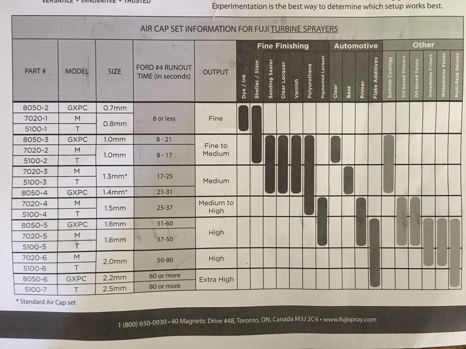 @BeatNavy Looks great... i mean, you can always sand the orange peel out of the clear anyway, right? (IMG:style_emoticons/default/biggrin.gif) Yeah, I mean some of it came out really nice actually. I think I could have laid more paint down on some of it to give myself more chance for polishing / paint correction, but I am pretty happy with this setup's potential (once the operator gains at least a little experience). Another benefit I didn't mention previously: it could be the paint I used, or more likely it's the minimal overspray, but the garage just smelled better. With my old paint / preval sprayers (which are absolutely horrible, don't get me wrong), the whole garage would smell toxic for an hour or more. With this thing I almost felt like I didn't need the respirator - no mistake, I definitely wore it, but there was nowhere near the overpowering smell of chemicals I was used to before. Oh the wasted brain cells.... (IMG:style_emoticons/default/blink.gif) @BeatNavy What size air cap did you use? It seems like they come with a 1.3mm, which is fine for primer, but the 1mm or 0.8 is better for base/clear? It comes with the 1.3 needle / air cap, but you can definitely buy the others. According to the chart they provide (below), that's right in there for auto base color paint application. For primers, especially epoxy stuff, you need to go larger. As mentioned, one of my mistakes initially was reducing 1 to 4 (as instructed by retailer). I should have gone by the Ford #4 runout cup (supplied) time as in the chart below. |